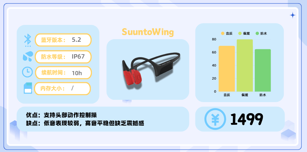 Suunto Wing 以 舒适的佩戴体验、清晰音质、出色稳定性 和 夜间可视 LED 灯 为亮点,特别适合夜间或户外运动爱好者。其开放式骨传导设计兼顾音乐体验与环境感知,在跑步、骑行或其他户外运动中都能提供安全与舒适的双重保障,是高端户外骨传导耳机的优选。