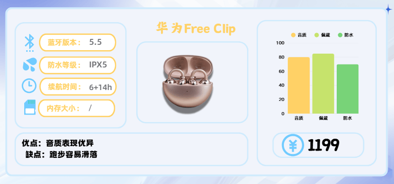 在音效方面,Free Clip 配备 16.2mm 高灵敏动圈单元,并结合华为自研 数字声学算法,呈现 清晰细腻的音色和 均衡的三频表现,尤其在人声与轻音乐演绎上更加自然柔和。耳机采用 定向声场技术,声音精准传递至耳朵,有效 降低音漏,即使在 图书馆或安静办公室,也能保持 私密舒适的聆听体验。