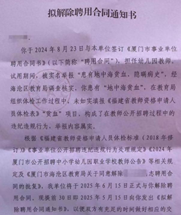 极目新闻《厦门幼师因“地贫”基因遭解聘,当事人:期待人社局的回复,希望继续当幼师》