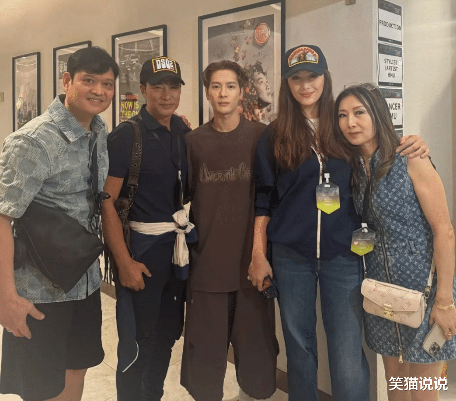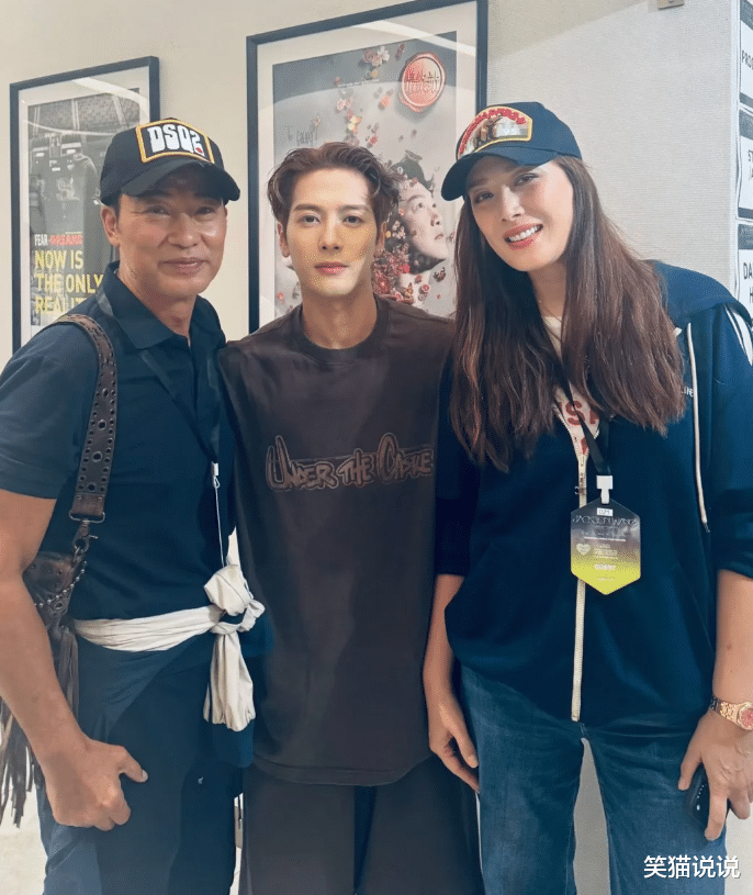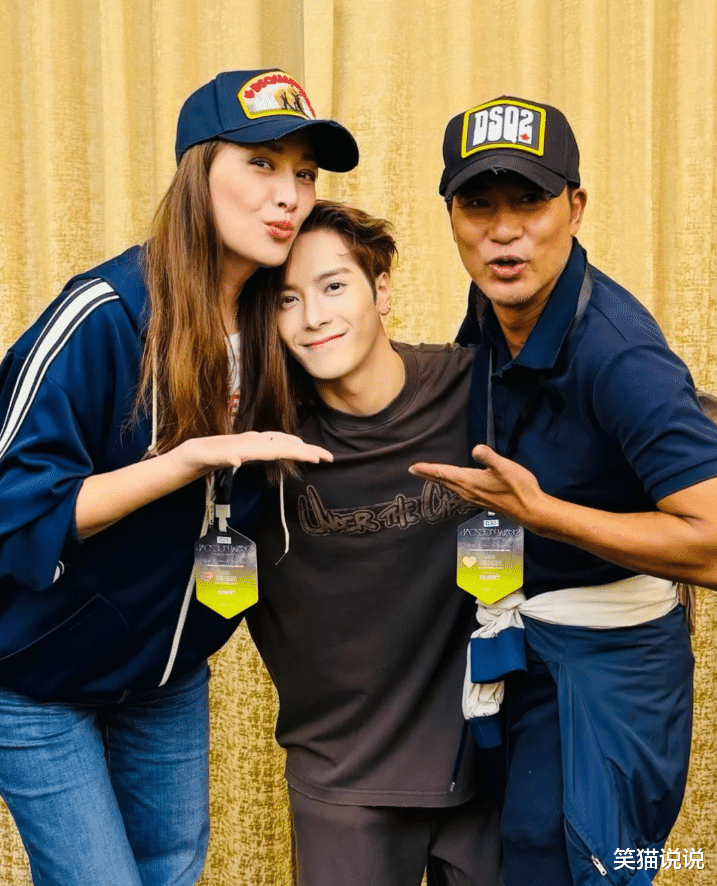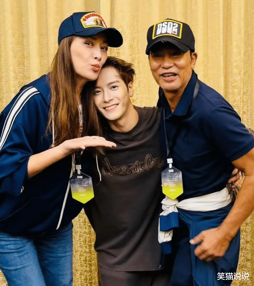 琦琦和任达华各站在王嘉尔的两侧,两人都拦着王嘉尔合照。彼此都伸手做出一个展示的动作,像是在夸赞自家的宝贝一样,氛围很欢乐。站在中间的王嘉尔则是露出了有点腼腆的笑容,脸上略带疲惫感,但是他依然是那么帅气。
