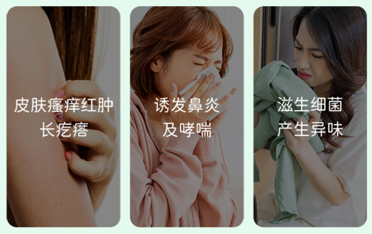 对普通人群来说,长期接触可能导致皮肤干燥、莫名瘙痒,尤其后背、手臂等接触床品的部位;对过敏体质、老人、小孩或哮喘患者更不友好 —— 这些微小颗粒会随着呼吸进入呼吸道,诱发打喷嚏、流鼻涕、鼻塞,甚至加重哮喘、湿疹症状。