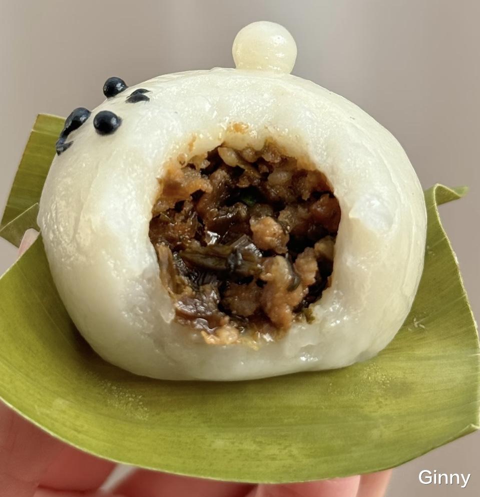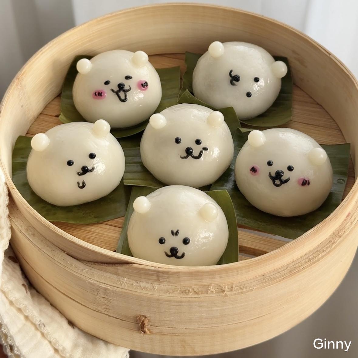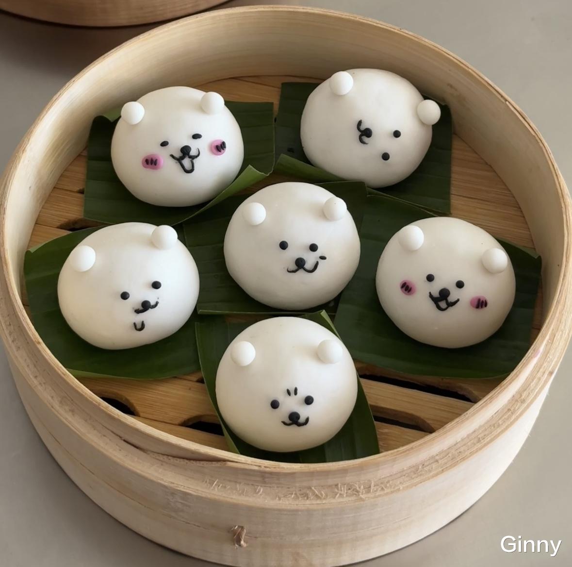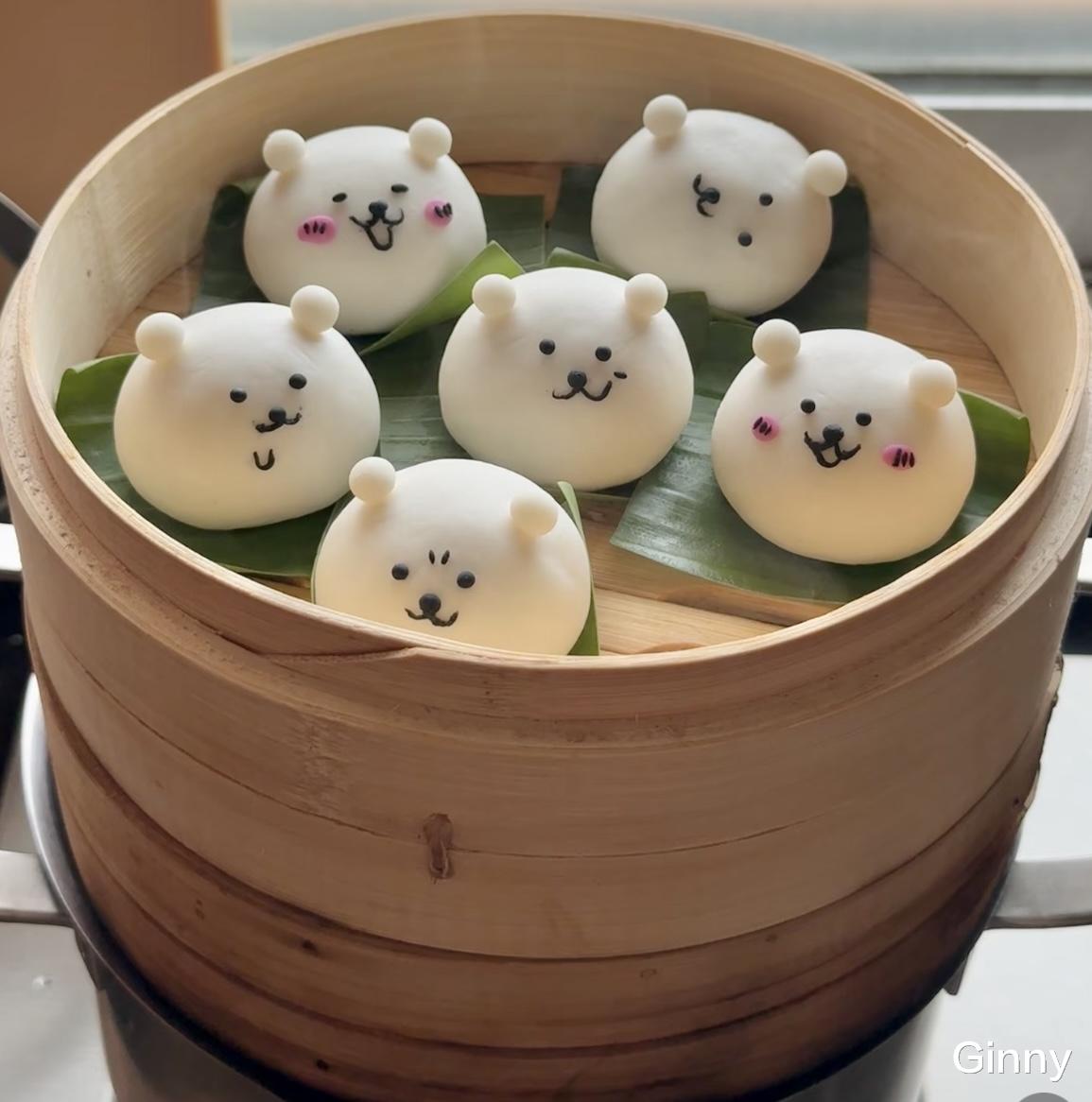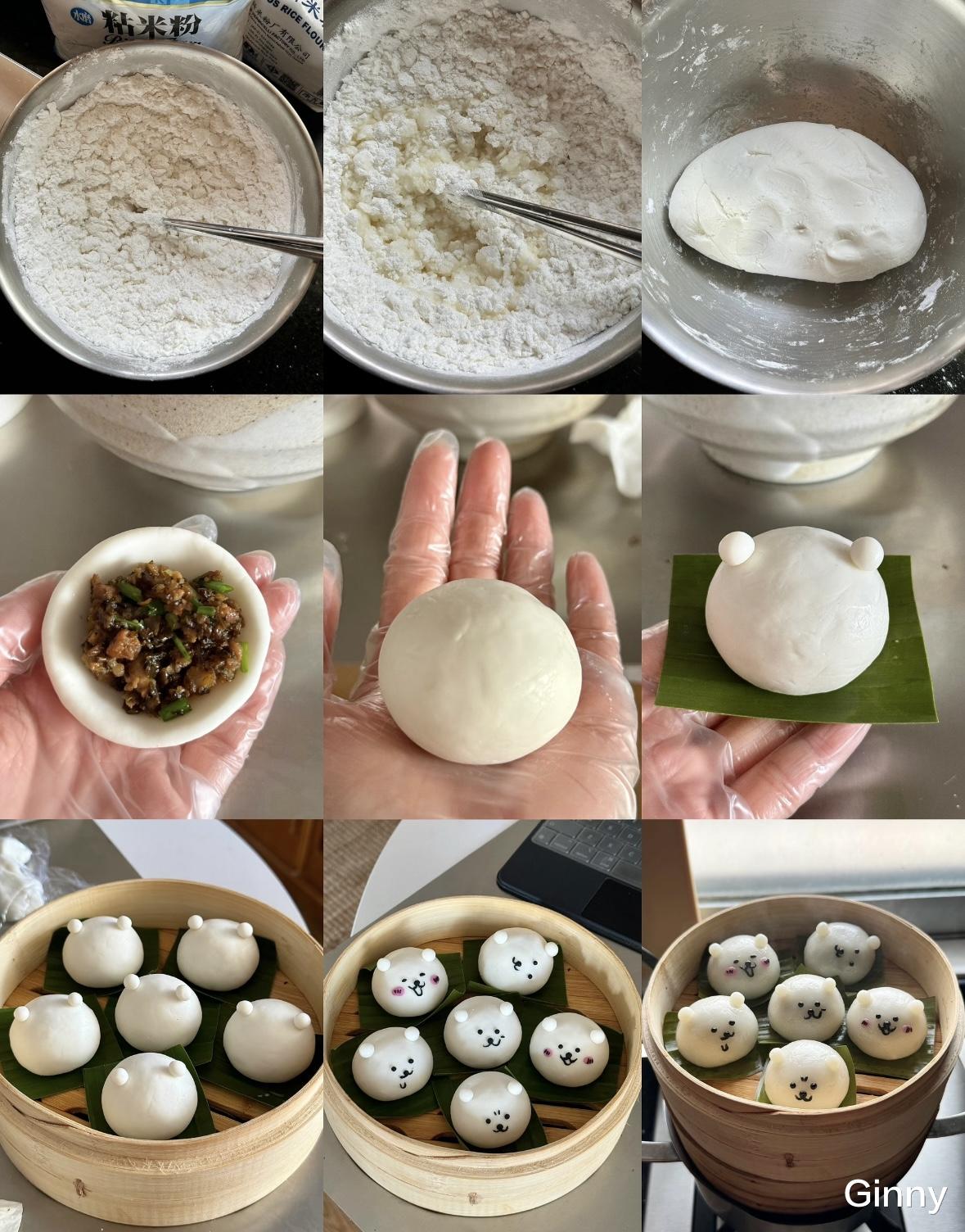 3️⃣将皮分成35g每个,压扁后包入馅料,收口捏紧后给小熊加上耳朵和表情