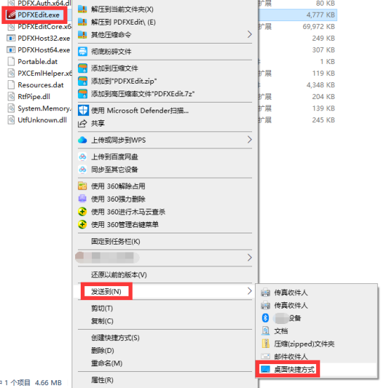 5、找到【PDFXEdit】程序文件,鼠标右键,点击【发送到】,【桌面快捷方式】。