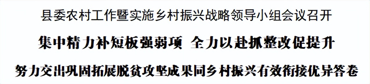 会议传达全市巩固拓展脱贫攻坚成果考核评估发现问题整改工作培训会议精神,安排部署当前重点任务及专项督导工作,县农业农村委、县教委、县水利局、花田乡现场发言,县住房城乡建委、县医保局、县卫生健康委、县人力社保局、车田乡、浪坪乡书面汇报。