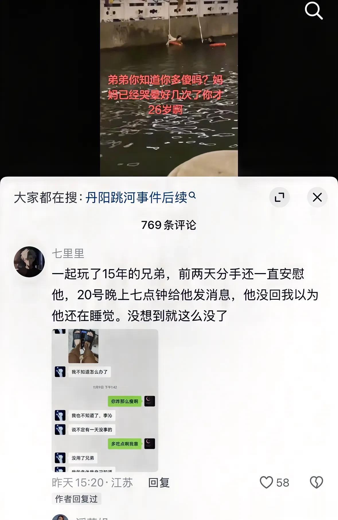 11月20日,江苏丹阳发生一起令人无比悲痛的事件:一对年轻情侣发生了矛盾,女孩在一时冲动跳进了河里。随后,男孩为了救她也跳了下去。最终,女孩得救了,男孩的生命却永远停留在了冰冷的河水里。
