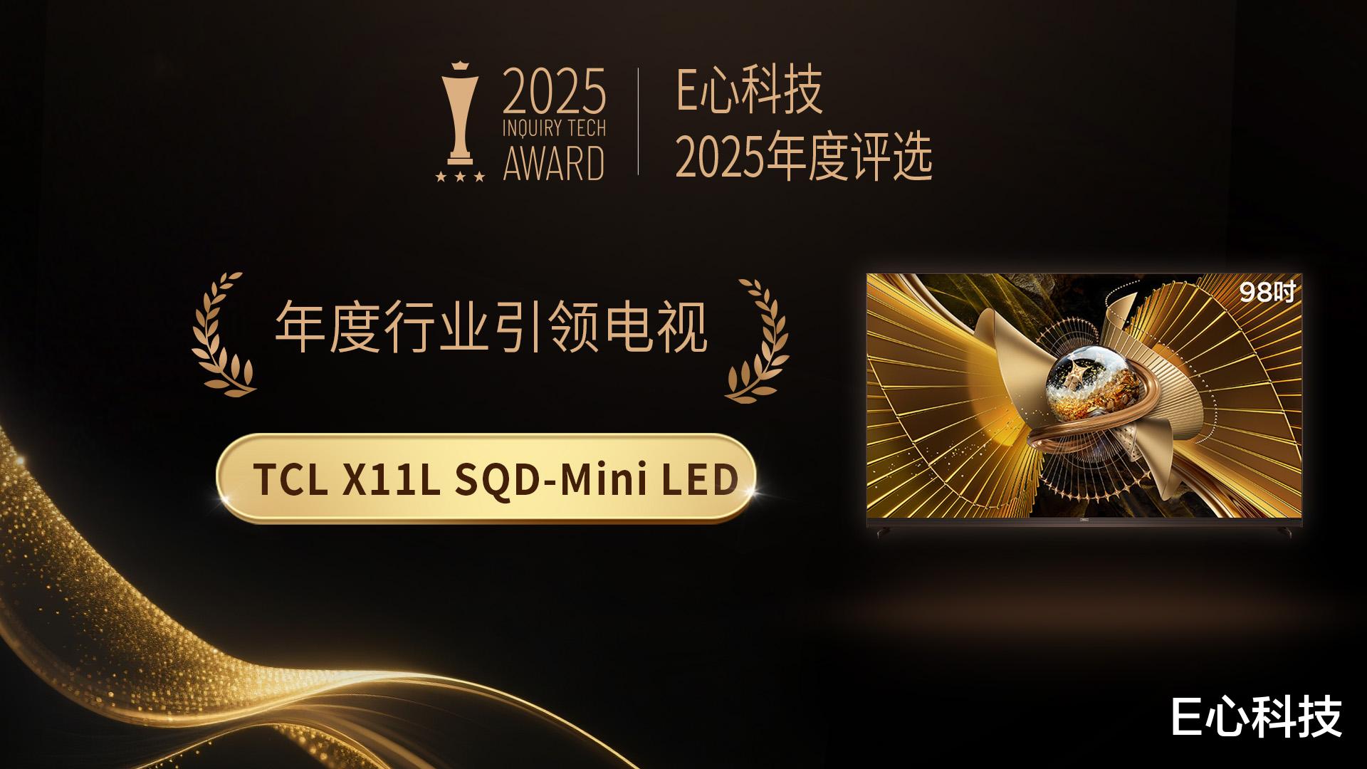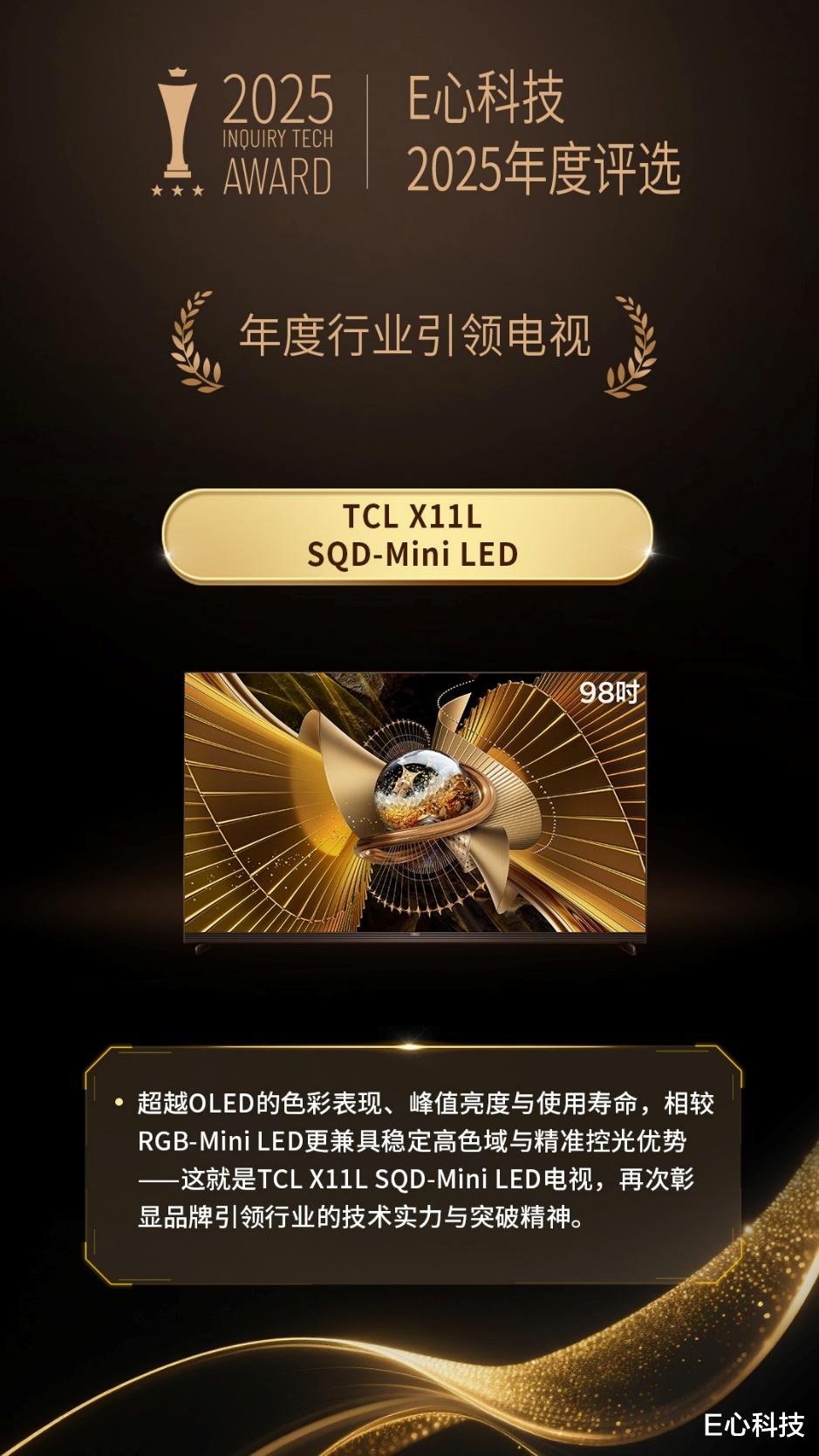 在本次E心科技2025年度评选中,TCL X11L SQD-Mini LED荣获“年度行业引领电视”奖。