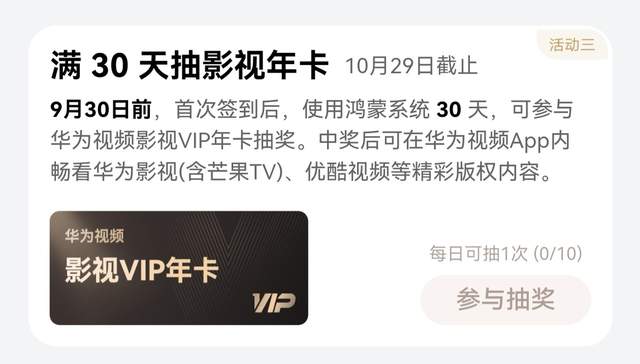 现在我简直是个“会员富翁”,正当我可以躺平享受的时候,华为又给我来了个“王炸”。在我签到第30天后,还解锁了一个全新的抽奖活动——抽影视VIP年卡!如果你已经签到了一个月左右,赶紧去看看!