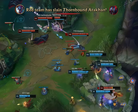 比赛进行到中期,出现了一些转折。15分钟时,G2上路越塔杀了发条,不过TES迅速接团,并最终获胜。到了20分钟,TES拿下厄塔汗,369的剑魔更是在下路一拖五,随后TES支援击杀G2三人,进一步扩大了战果。