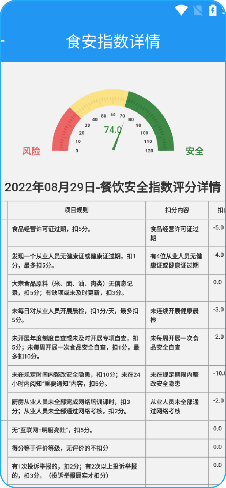 “餐饮安全指数”的设置主要遵循“预防为主、风险管理、全程控制、社会共治”的原则,从企业自律、部门监管、公众监督三个维度收集原始数据。指数由基础项目、否决项目、加分项目3个大项22个子项组成,通过智慧监管系统自动综合评分画像,最终生成一个反映餐饮单位食品安全综合情况的食安动态指数(0-120分),得分越低表示食品安全风险越大,得分越高表示食品安全风险越小。