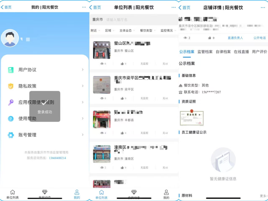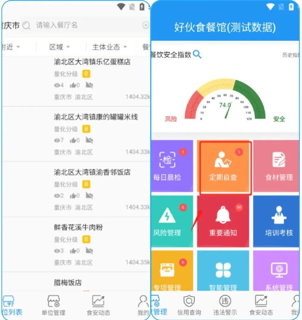 “渝食安”可在线办理食品经营许可、备案等业务,还能通过“餐饮安全在线”模块开展每日晨检、食材管理、风险自查等十项管理操作。