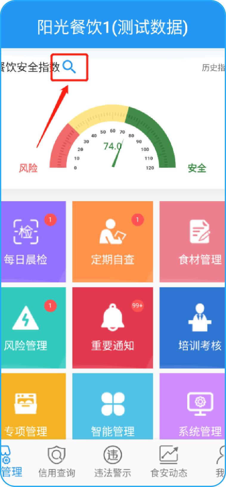 从业者点击“餐饮安全指数”的放大镜查看前一天的食安指数分数情况,历史指数展示前十天的指数数据,点击小圆圈可以查看那天的情况。