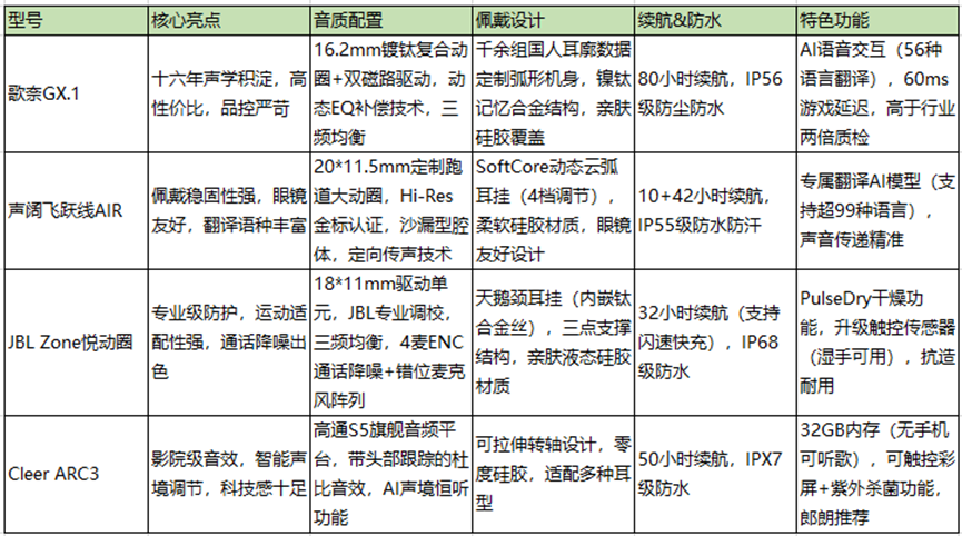追求高性价比和全场景适配,优选选择歌奈GX.1,均衡的音质、舒适的佩戴、超长的续航日常通勤、运动、办公都可以佩戴,严苛的品控也保证了它的耐用性。运动为主选JBL ZONE,稳固的佩戴体验选声阔飞跃线,沉浸的音质选cleer。四款各有各的特点,就看你在哪个场景下用了。