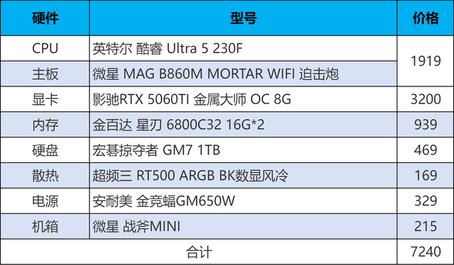 配置一:低功耗小钢炮畅玩2K游戏这套配置围绕英特尔酷睿 Ultra 5 230F 处理器、微星MAG B860M MORTAR WIFI7迫击炮与影驰RTX 5060TI 金属大师 OC 8G 显卡打造,轻松应对主流游戏与日常创作。