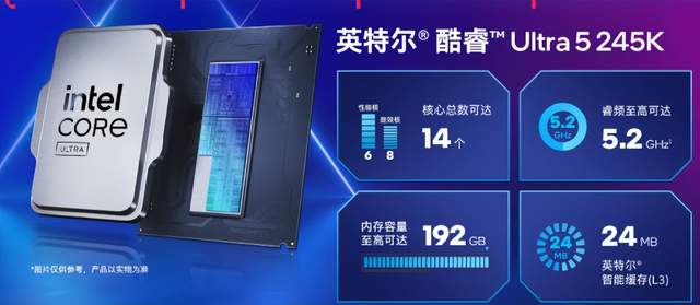 英特尔 酷睿 Ultra 5 245K采用了全新的ArrowLake 架构,拥有6颗性能核+8颗能效核的配置,共14核14线程,缓存为24MB,性能核最大睿频频率5.2GHz,实现了更低的功耗以及更高的多线程性能。