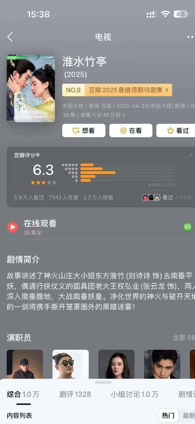刘诗诗、张云龙主演的《淮水竹亭》首播创下爱奇艺站内热度7569的年度纪录,但在五一假期后热度下滑,被质疑“高开低走”。
