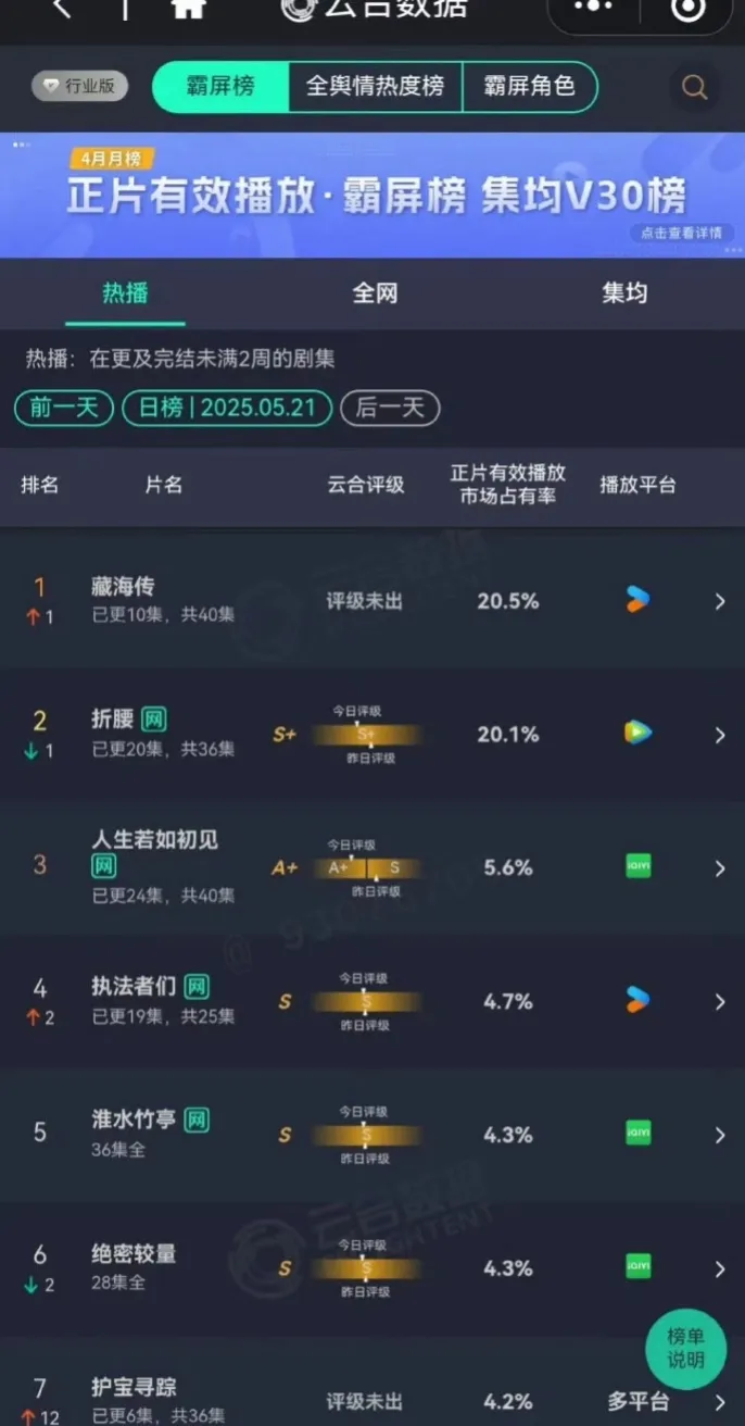 S级的制作播出了S+的效果,市占20.1%,海外市场TOP1。谁家剧播一半就开分啊,而且6.4这个分数不知道有多少是纯对演员的恶意,根本不是在认真看剧讨论演技剧情的,这个分数是对整个《折腰》剧组的不尊。,不应该被恶意打分,而且不该这么快就草率开分。