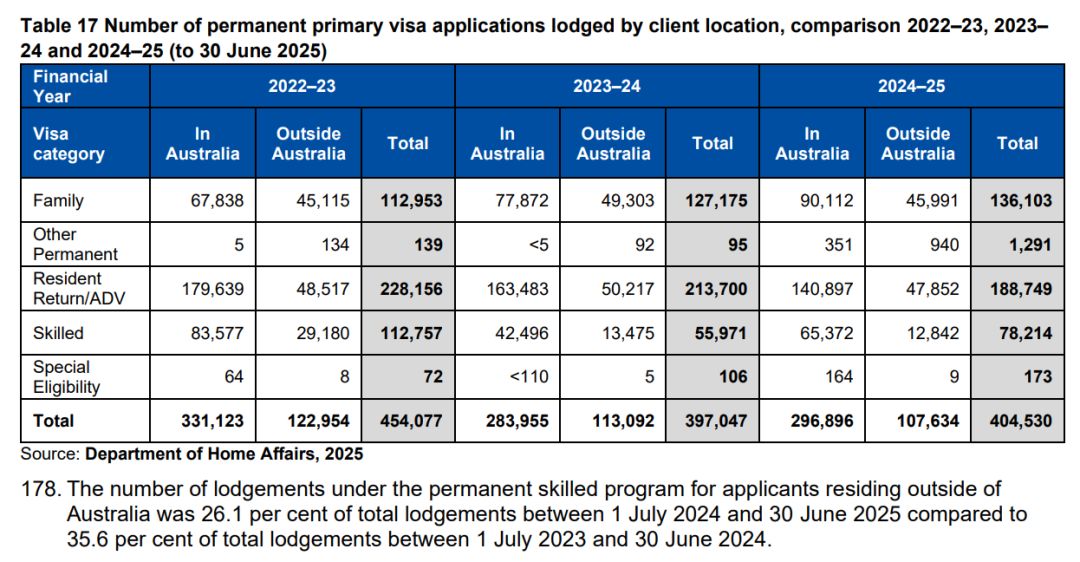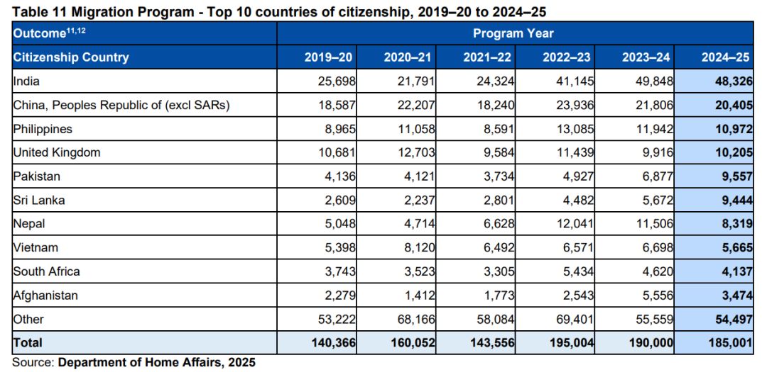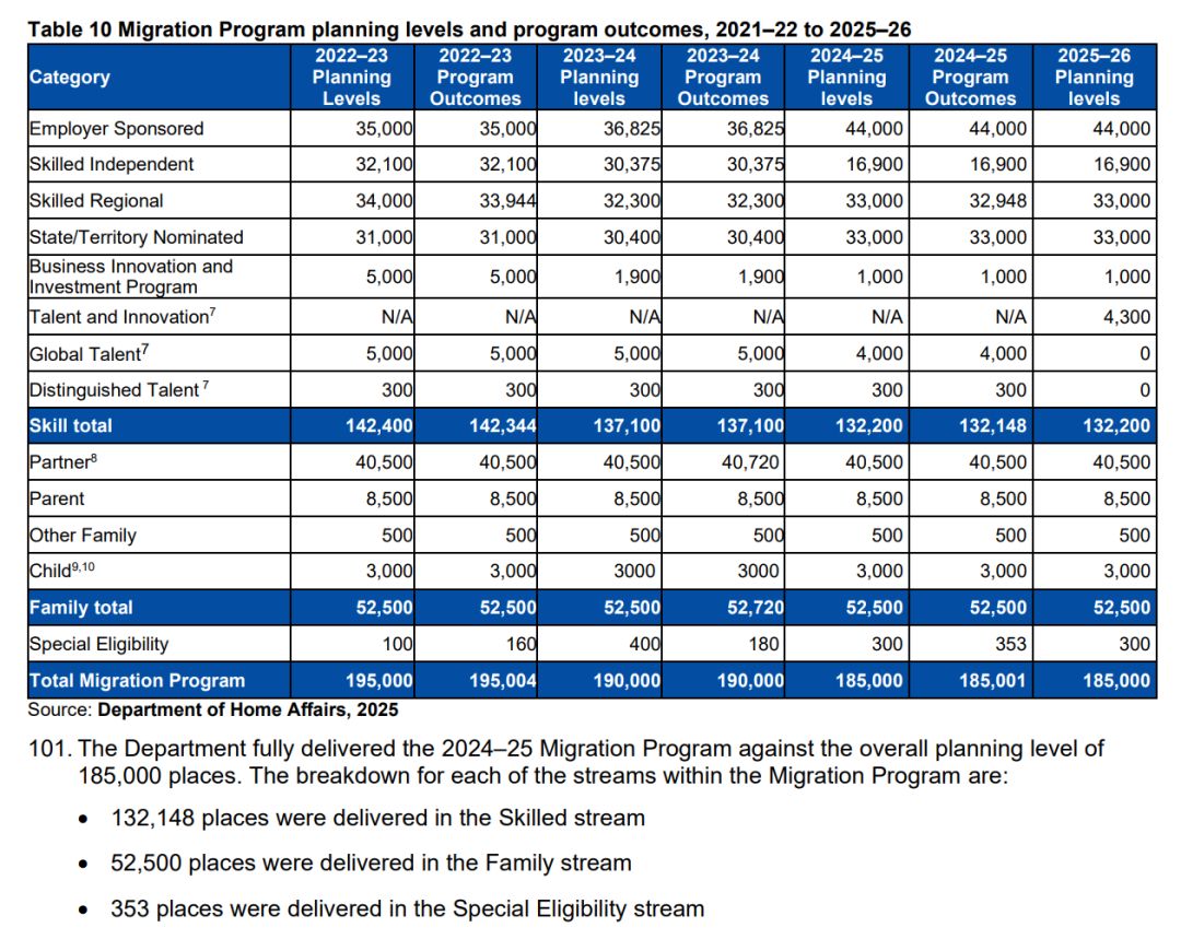 根据数据,24-25财年的澳洲移民局实际共发放185,001个移民签证,其中包含: