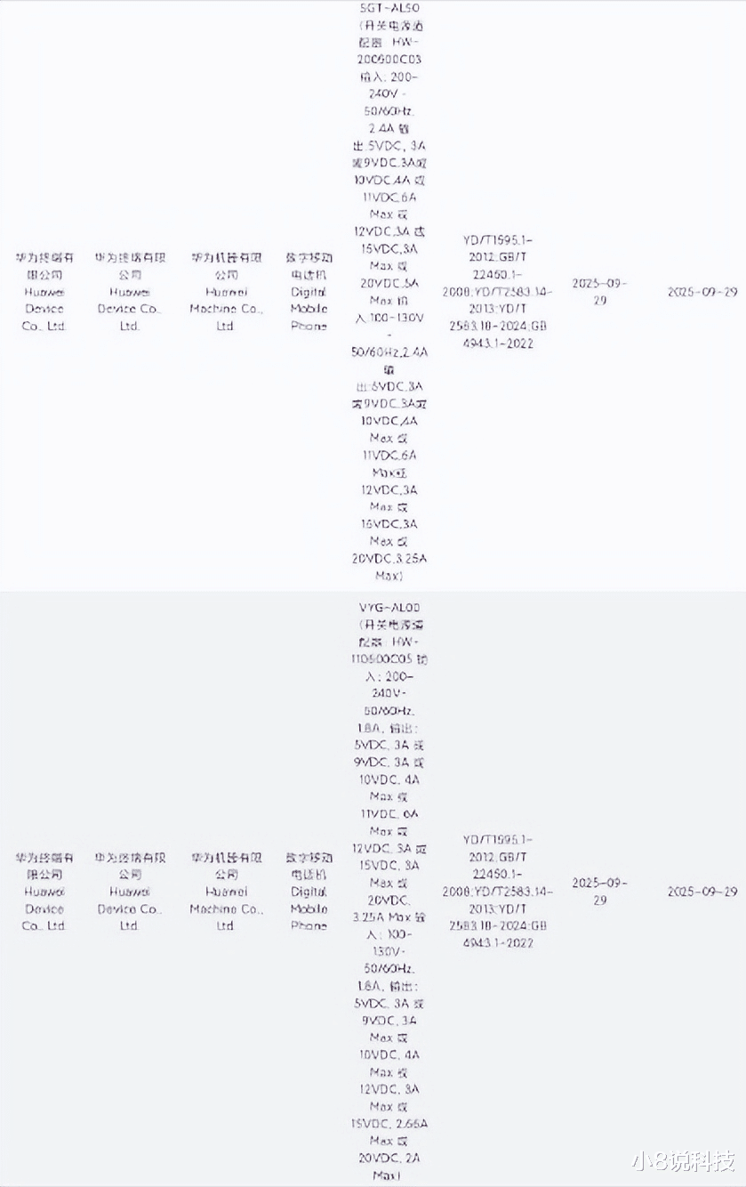 从备案信息看,三台新机的充电能力差别挺大。VYG-AL00是66W有线充电,而SGT-AL00和SGT-AL50直接拉满到了100W。