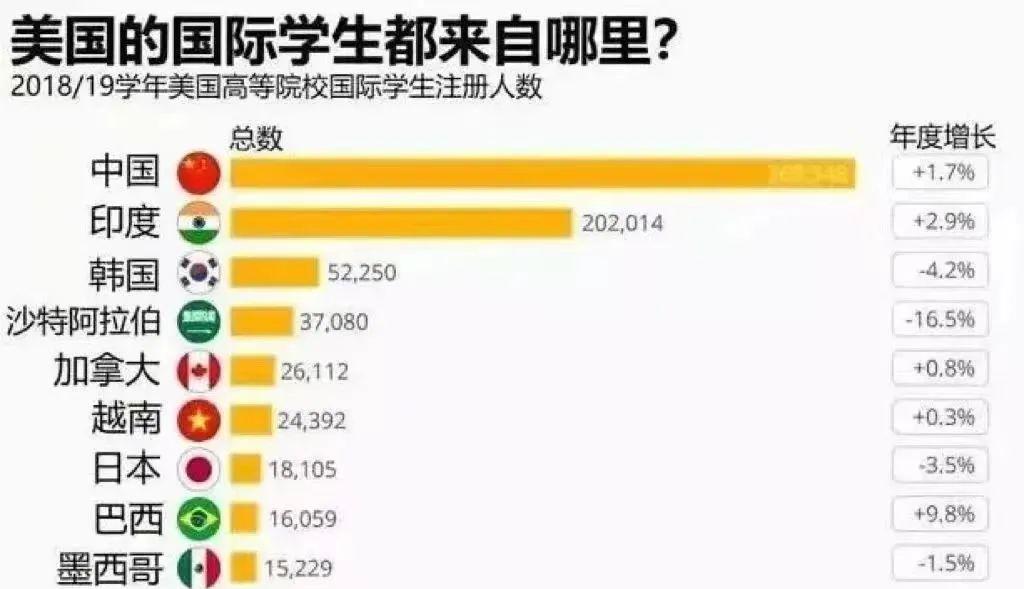 所以我们就看到,之前从我国顶级学府毕业后去美国留学的高科技人才有很多,但是回国的却很少,南开教授艾跃进就曾经指出过这一点,实际上到美国留学最多的其实就是来自我们的留学生,请看下图。