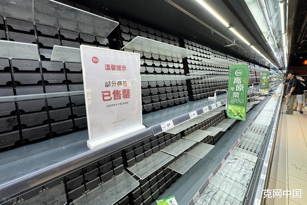 收银台排起长龙,有人抱着成箱的矿泉水,有人手里紧紧拽着几袋泡面。一个年轻母亲推着孩子,神色慌张;收银员额头冒着汗,手都快来不及扫条码。