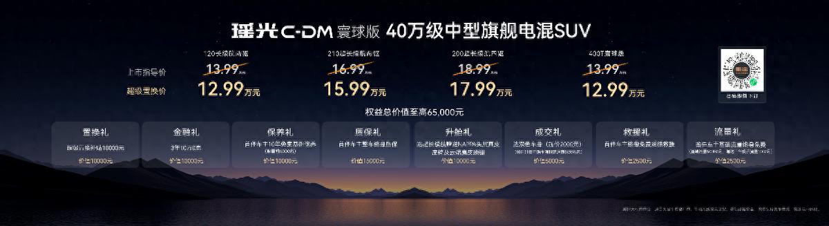 本次上市共有瑶光C-DM寰球版120长续航两驱、210超长续航两驱、200超长续航四驱3款配置版型,指导价分别为13.99万元、16.99万元、18.99万元。新车以40万级豪华品质、40万级豪华安全、40万级豪华性能三大核心优势,重新定义40万级旗舰电混SUV价值标准。同时,星途还为青睐燃油车的消费者提供了燃油版车型瑶光400T寰球版,指导价13.99万元。此外,新车还带来了价值65000元的权益政策 。