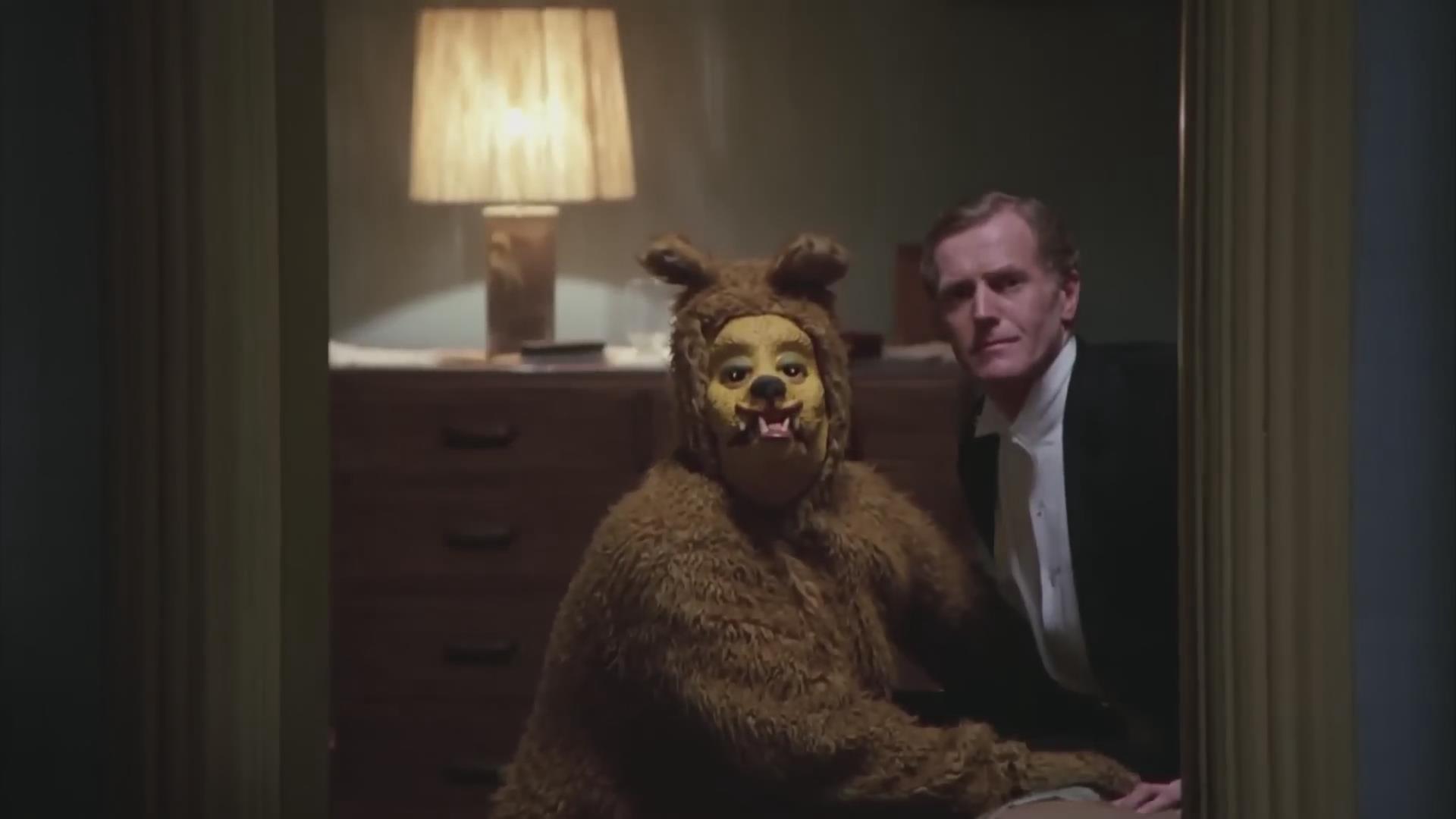 这一极具争议的理论同样始于《Playgirl》杂志——杰克阅读的1978年1月号包含《乱伦:父母为何与孩子同床》一文,结合杰克曾弄伤丹尼手臂的情节,研究者推测虐待可能涉及性层面。核心证据集中于丹尼的台词与视觉符号:托尼称"住在我嘴里""藏在我肚子里",被解读为创伤记忆的隐喻;丹尼与医生对话时不穿裤子、双手捂胯的姿态,以及对托尼话题的回避,被视为"性虐待创伤"的表现;电影中丹尼与"熊"的强关联(床上的熊抱枕、墙上的熊画),与酒店内"穿熊装男性"的诡异场景形成呼应,被解读为性虐待的视觉编码(小说中为狗装,电影改为熊装被视为刻意改编)。