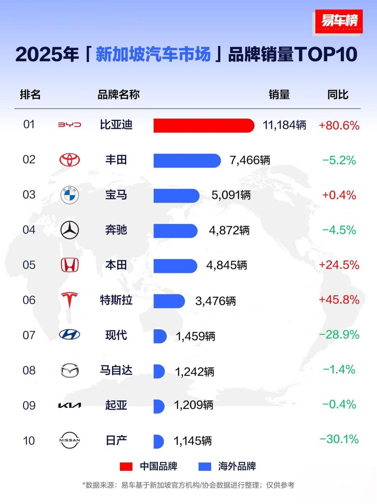 近期,新加坡陆路交通管理局最新数据显示,2025年比亚迪乘用车在新加坡销量达11184辆,同比增长80.6%,以21.2%的市占率蝉联年度全品牌销量冠军,成为当地首个年度销量破万的汽车品牌。自2022年正式进入新加坡乘用车市场,比亚迪仅用两年时间便完成从市场参与者到行业引领者的蜕变,以绝对优势领跑狮城汽车市场。