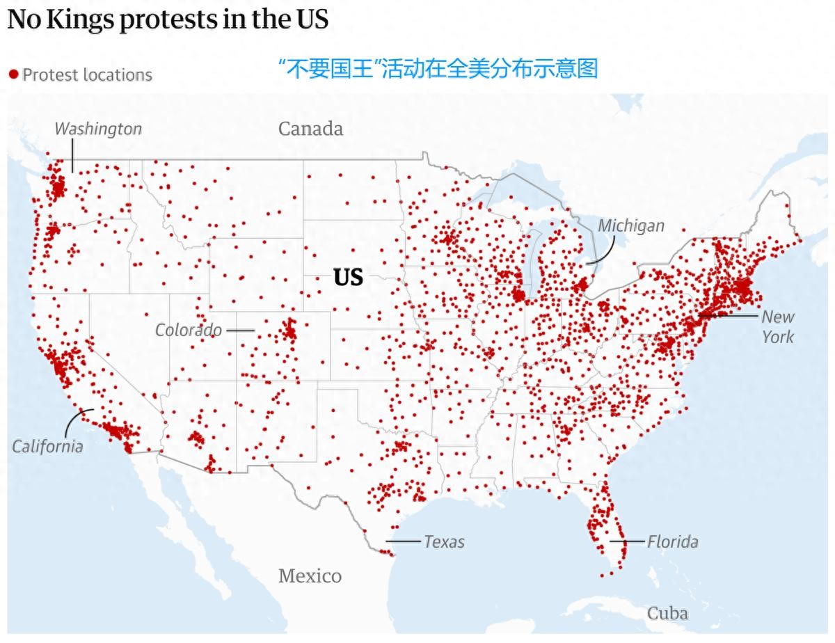 截至目前,第三轮“不要国王”运动已经在全美50个州举办了超3100场抗议活动,参与人数近千万人,已成为美国历史上规模最大的抗议集会之一。