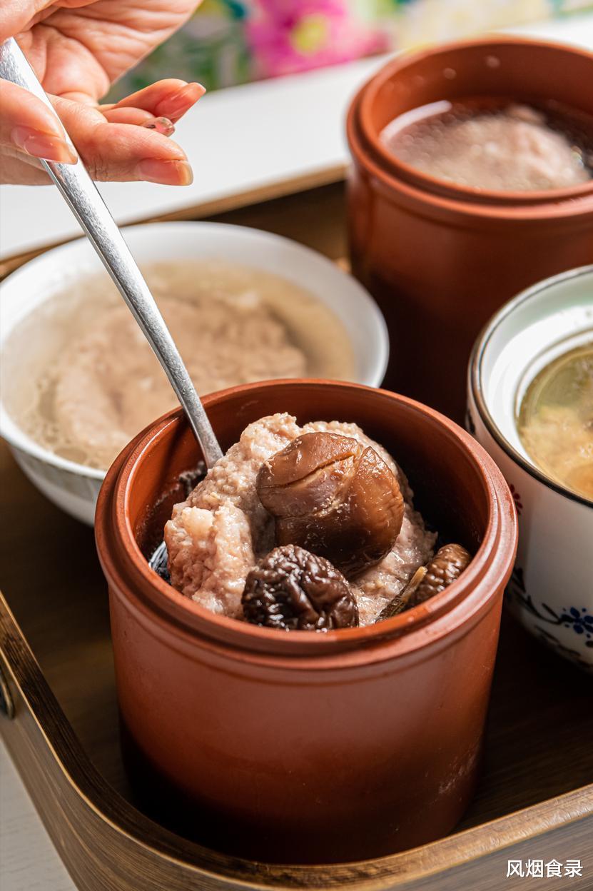 土陶瓦罐盛食材,封锡纸后置大瓦缸,六面受热,文火慢煨8小时,汤清如琥珀,肉酥可嚼,鲜香醇厚不腻人。