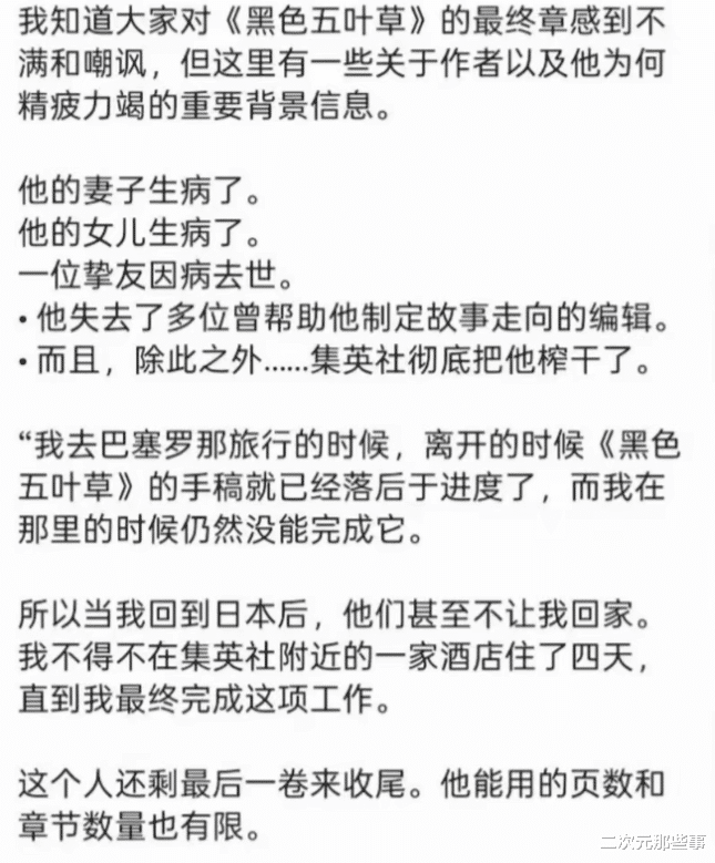 近日,一则关于《黑色五叶草》作者田畠裕基的爆料在网上引起了众多粉丝读者的关注。爆料者表示,在最终章连载的这段日子里,田畠裕基的妻子生了重病,他的女儿也卧病在床,一边要承受至亲接连倒下的煎熬,一边还要面对相伴多年的挚友因病离世的重击,连那些陪他打磨故事、敲定剧情走向的编辑,也一位接一位地离开,再也没人陪他并肩走完这段收尾的路。