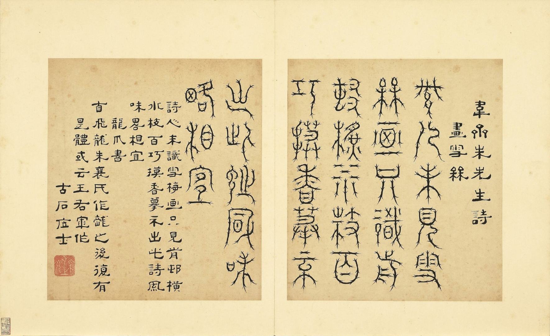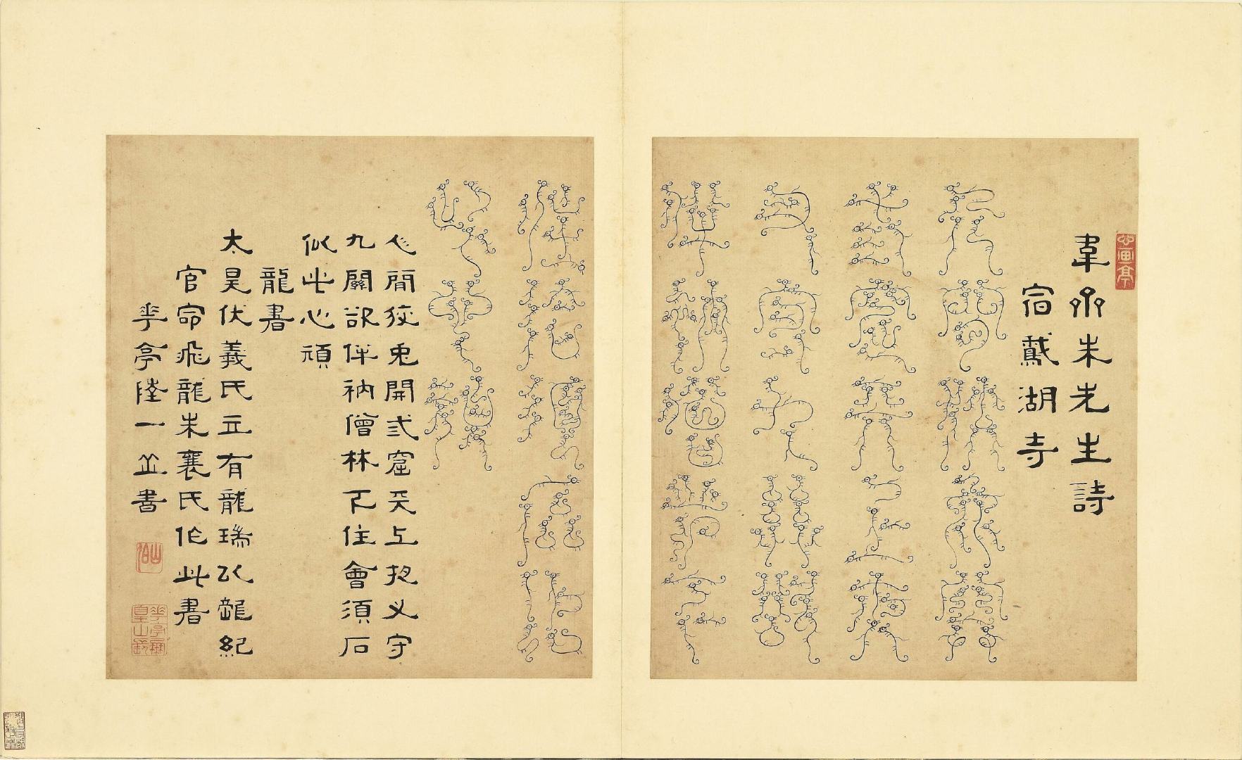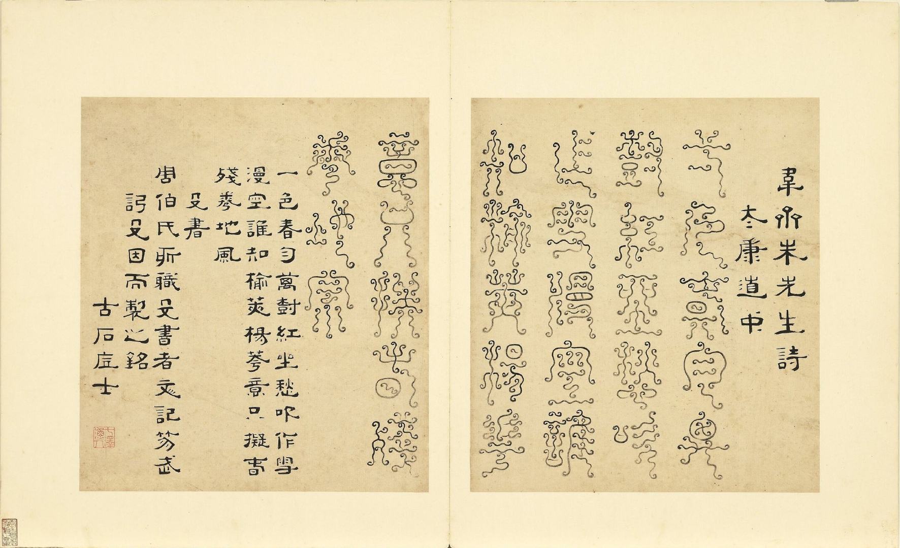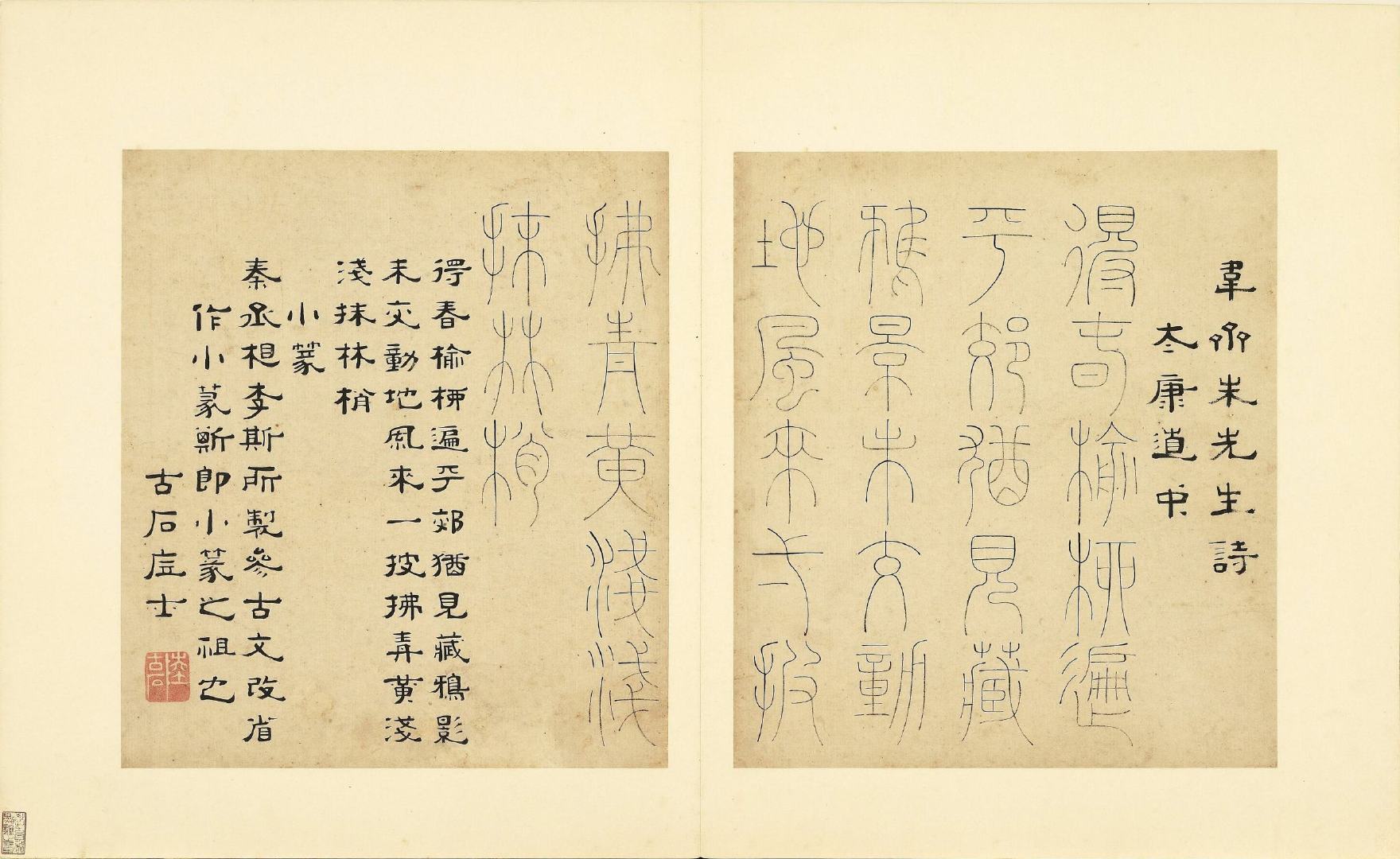 全册共六十开,每开用不同篆体书写韦斋先生(朱松)所作七言绝句,始于:灯夕在试院用旧韵(悬鍼篆)终于:卜居邨落(玺书)。前为篆体本文、后附隶书释文并注解该字体的历史渊源或传说。此册书于明正德二年,现藏于台北故宫博物院。