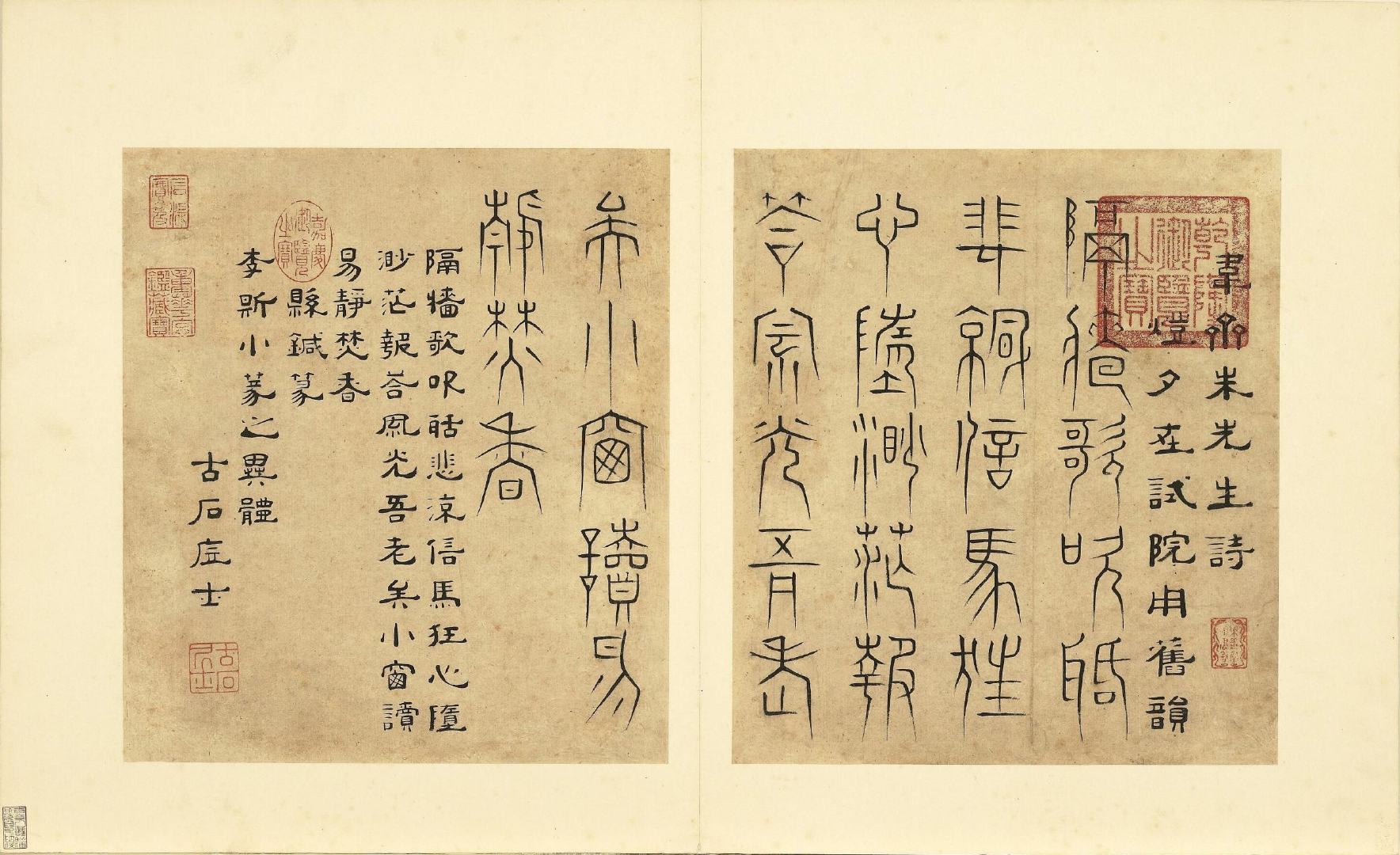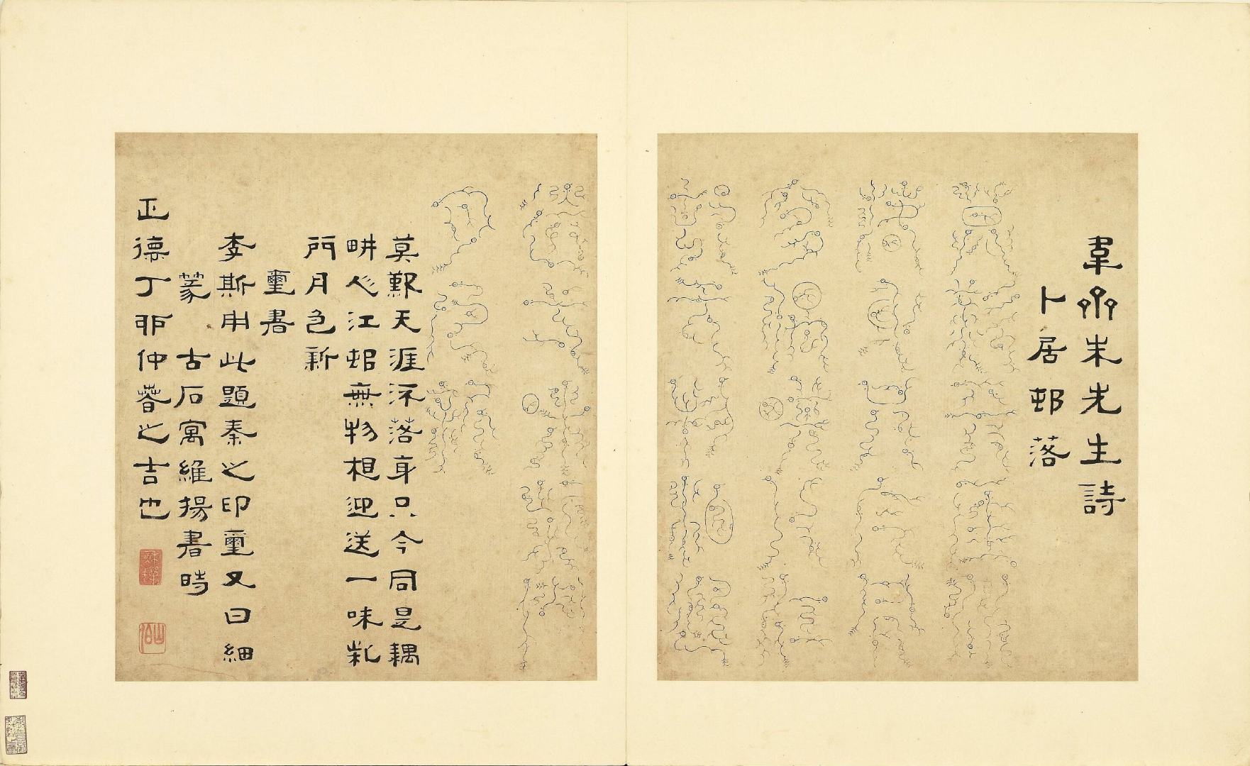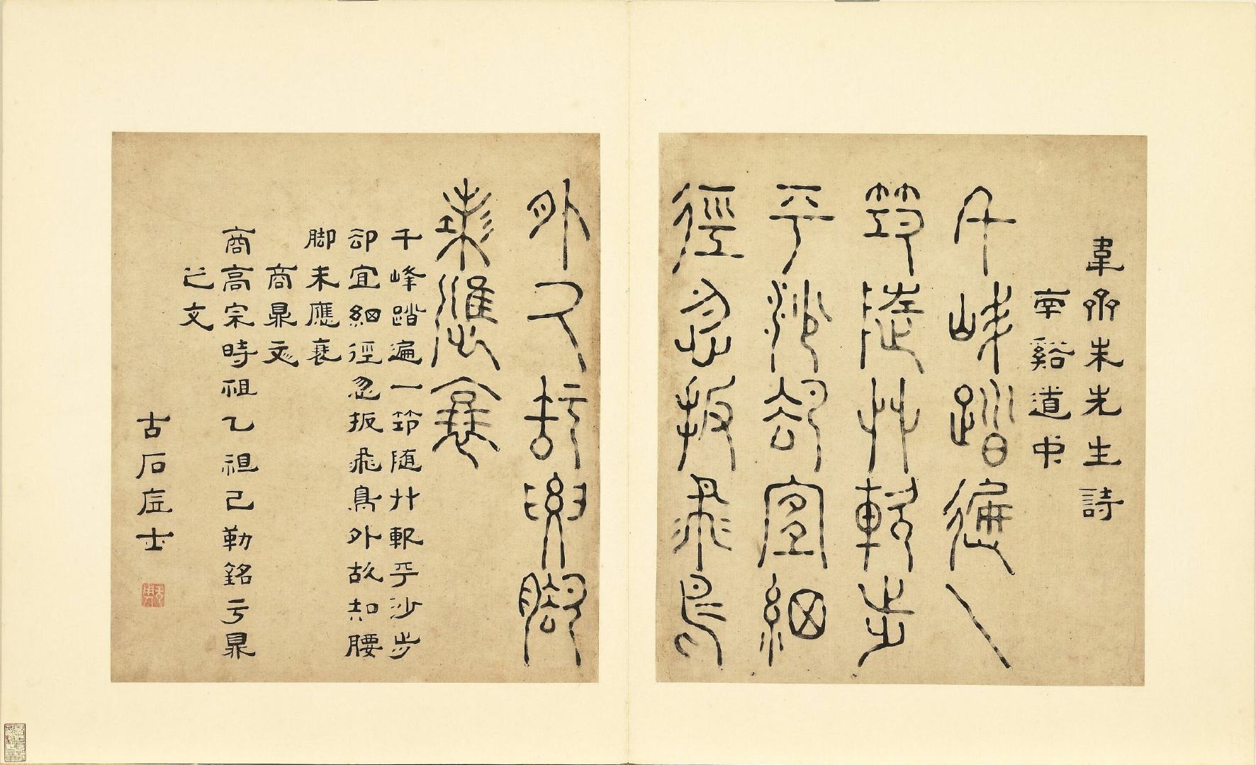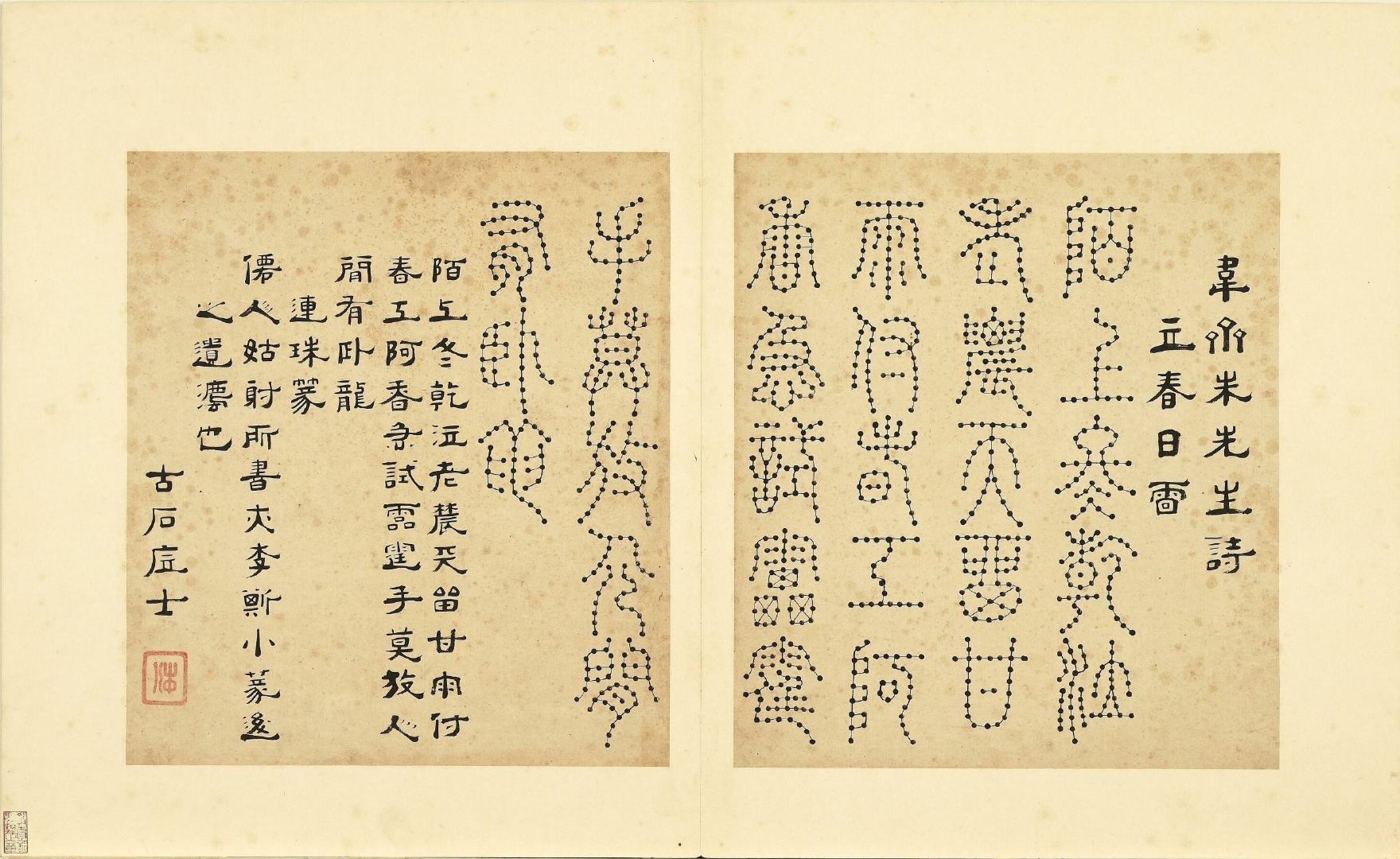 全册共六十开,每开用不同篆体书写韦斋先生(朱松)所作七言绝句,始于:灯夕在试院用旧韵(悬鍼篆)终于:卜居邨落(玺书)。前为篆体本文、后附隶书释文并注解该字体的历史渊源或传说。此册书于明正德二年,现藏于台北故宫博物院。