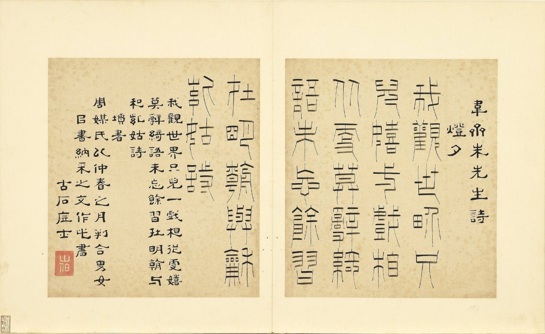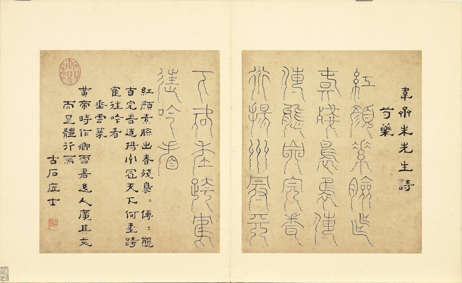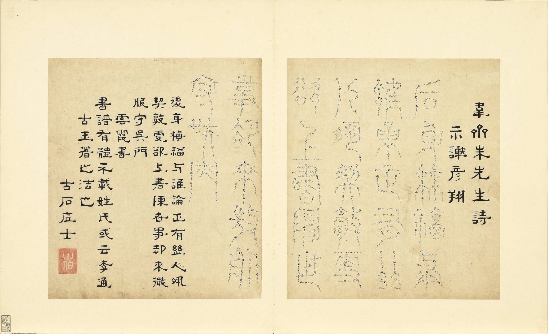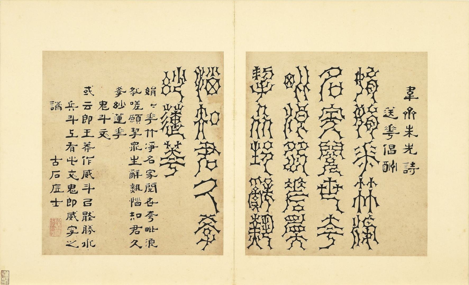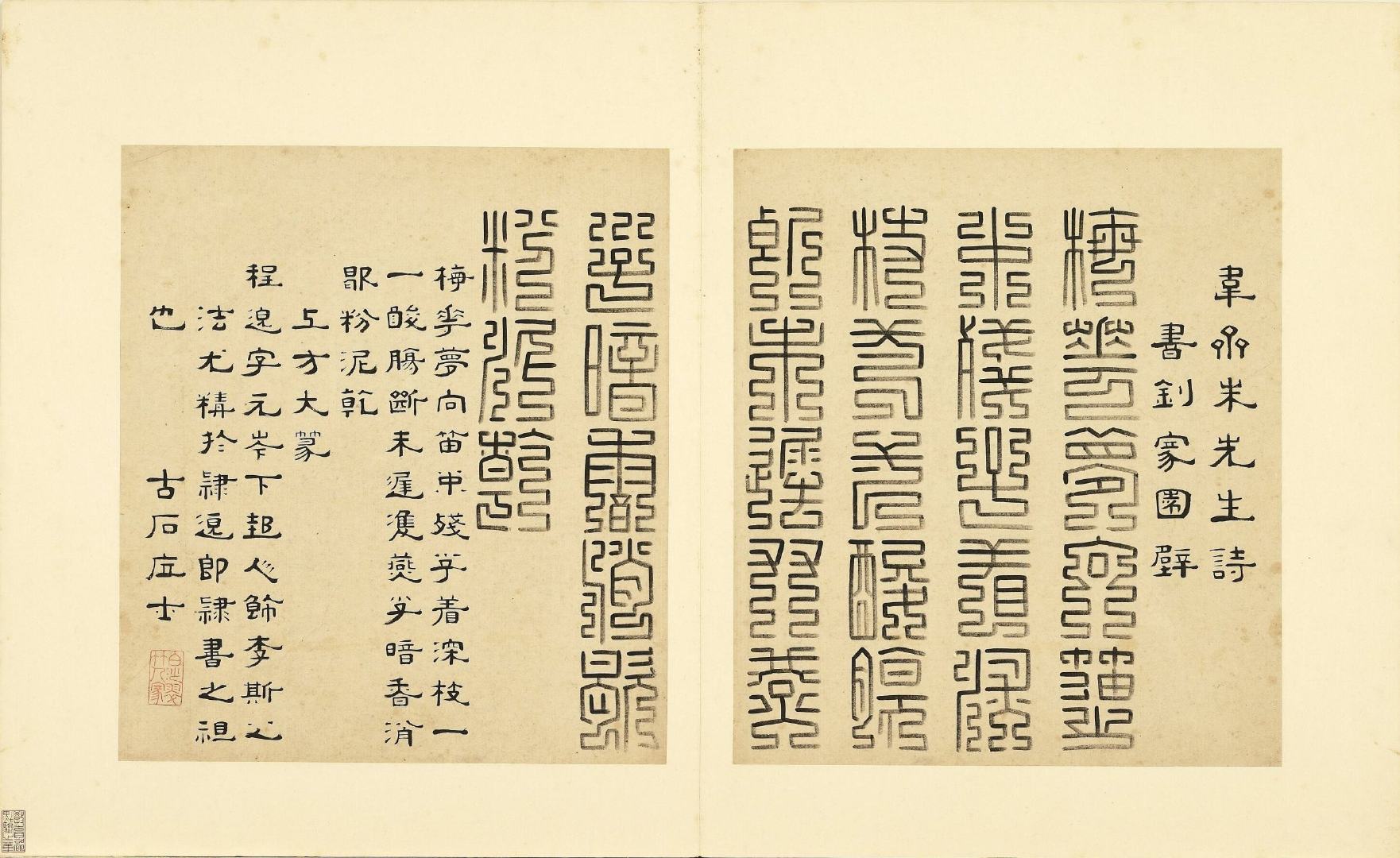 全册共六十开,每开用不同篆体书写韦斋先生(朱松)所作七言绝句,始于:灯夕在试院用旧韵(悬鍼篆)终于:卜居邨落(玺书)。前为篆体本文、后附隶书释文并注解该字体的历史渊源或传说。此册书于明正德二年,现藏于台北故宫博物院。