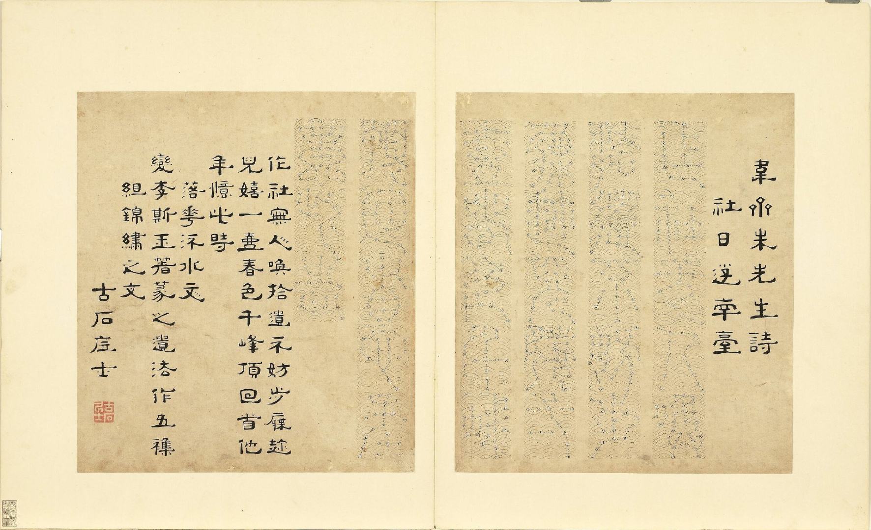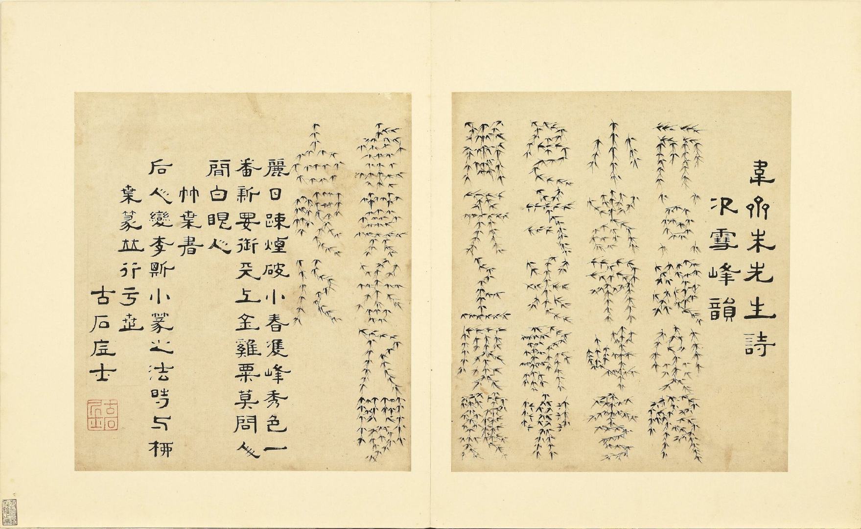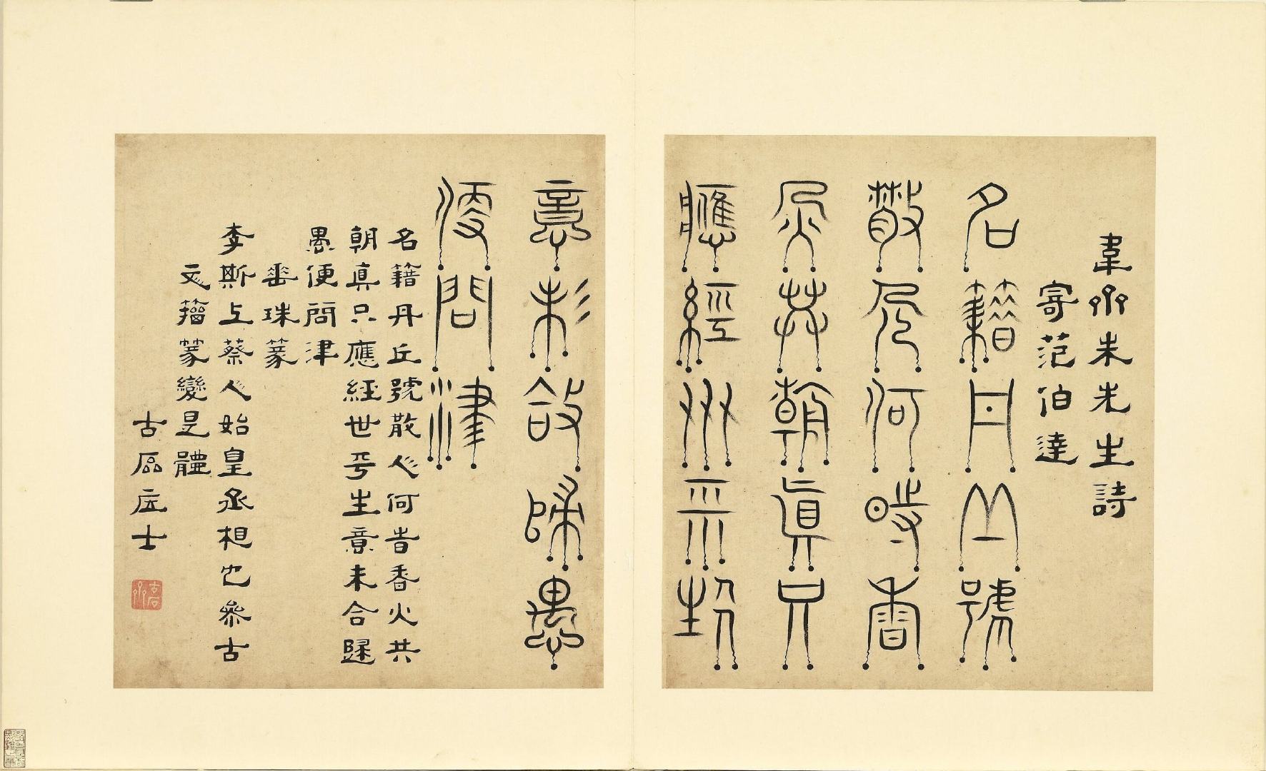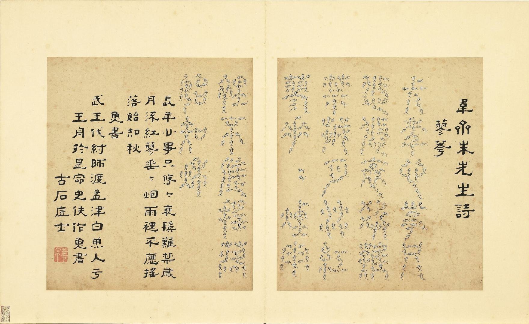 全册共六十开,每开用不同篆体书写韦斋先生(朱松)所作七言绝句,始于:灯夕在试院用旧韵(悬鍼篆)终于:卜居邨落(玺书)。前为篆体本文、后附隶书释文并注解该字体的历史渊源或传说。此册书于明正德二年,现藏于台北故宫博物院。