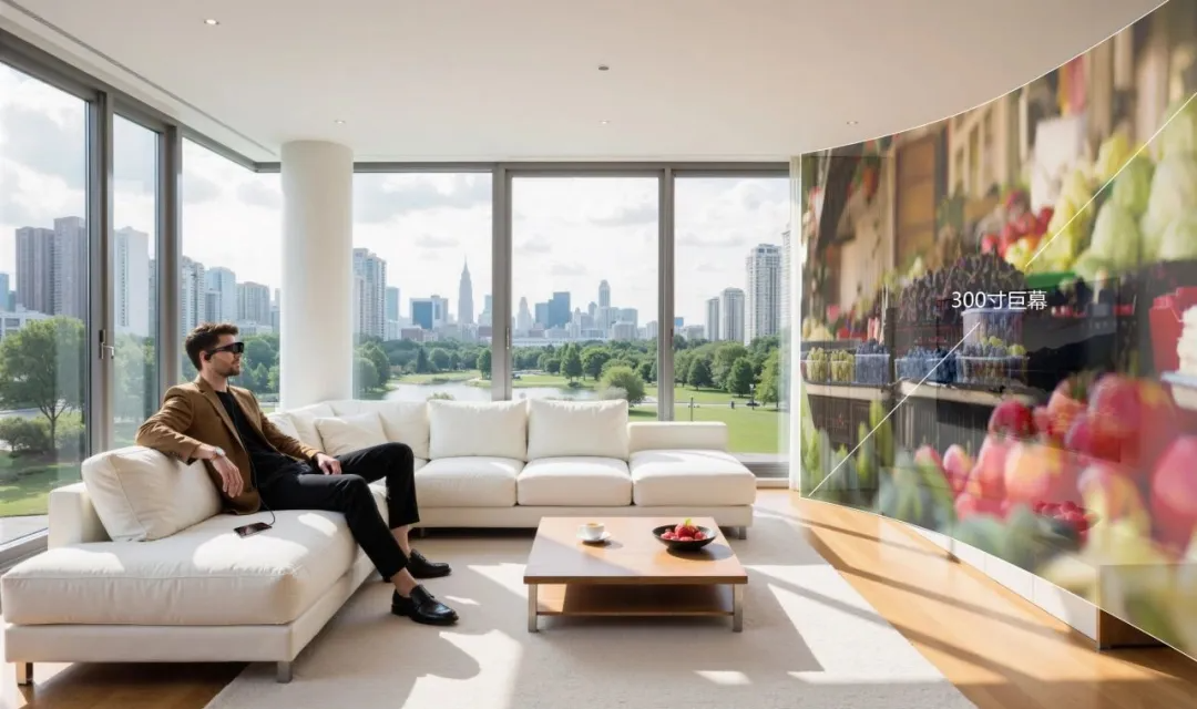 AR观影设备可以将虚拟的大屏幕投射到家庭空间中,用户无需安装大型投影设备,就能享受到影院级的巨幕观影体验,就像咔咔AR眼镜采用的光波导+DLP微显示技术方案,可打造300英寸高清巨幕体验。