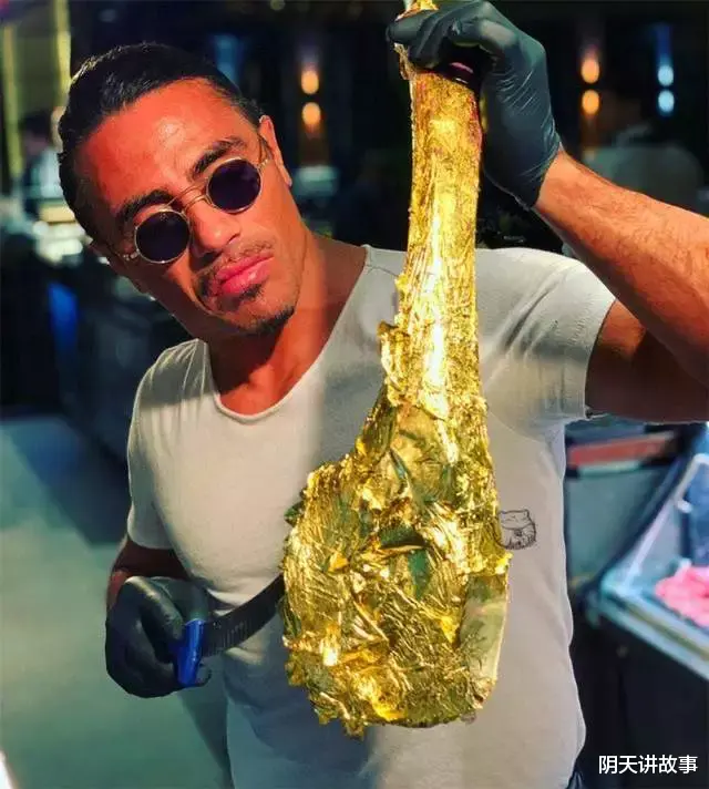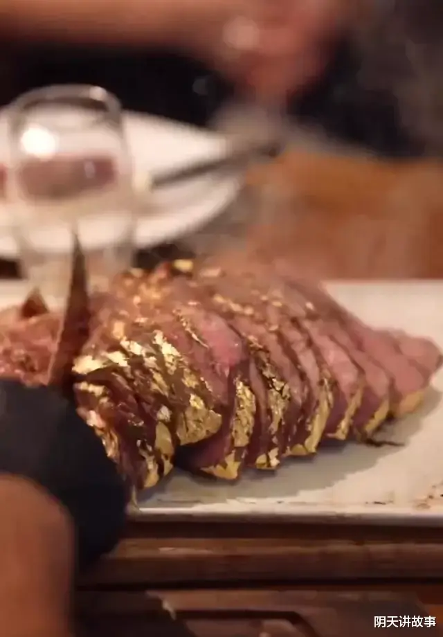 值得一提的是,撒盐哥餐厅的招牌菜就是金箔牛排,在普通牛排的表面涂上了一层可食用金箔,普通牛排可能只要几十欧元,加上了金箔之后就卖到了1000欧元(约合7500元人民币)。