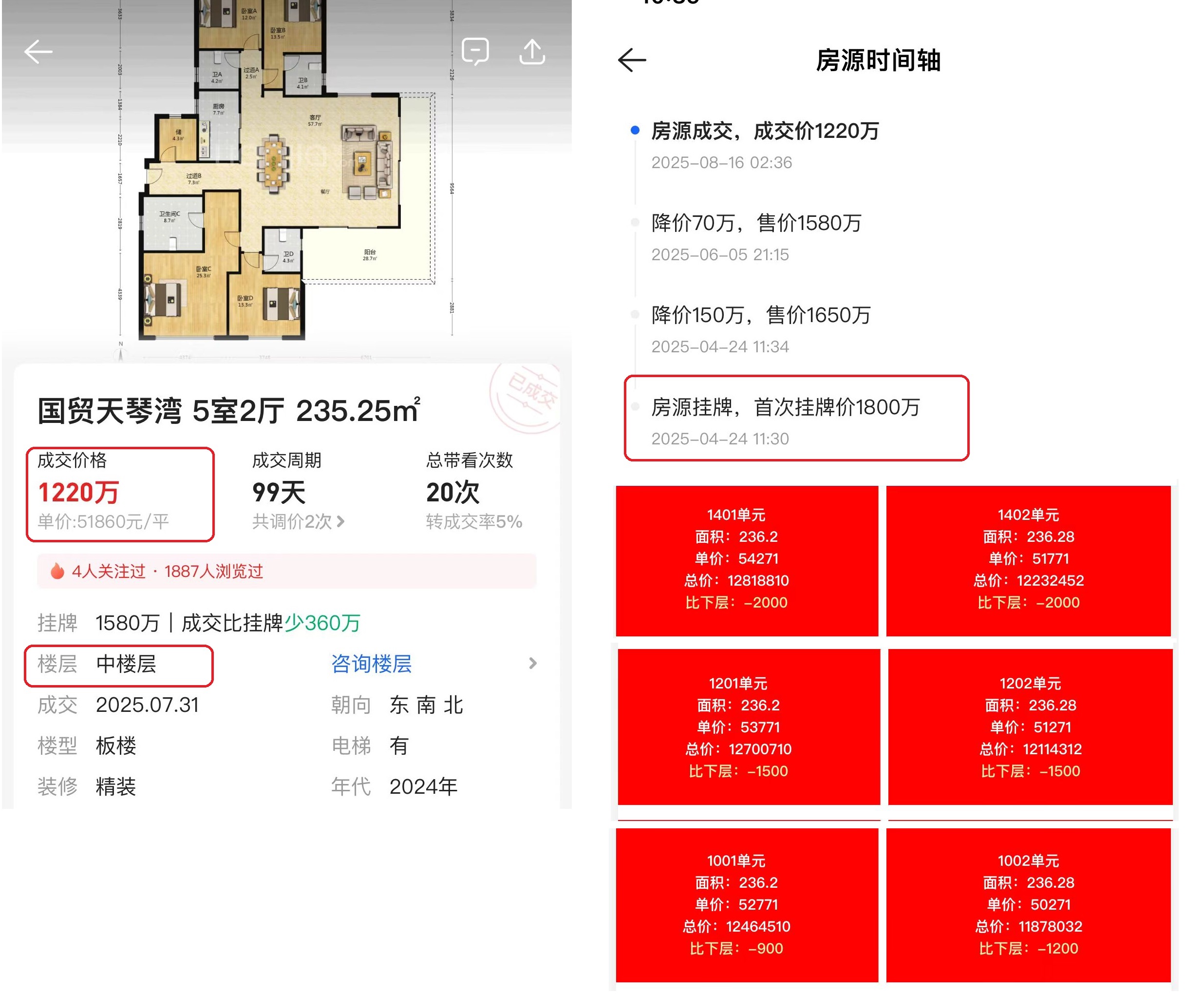 查看时间轴,首次挂牌1800W,单价7.65W,近3个月连续下调价格,最终降价580W成交。