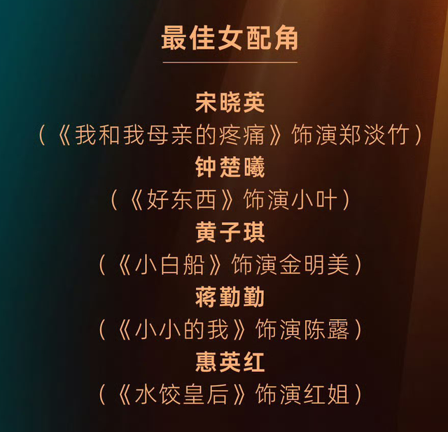 最佳男配提名的有周政杰,赵又廷,祖峰,袁富华,耿乐,最佳女配提名的有宋晓英,钟楚曦,黄子琪,蒋勤勤,惠英红。