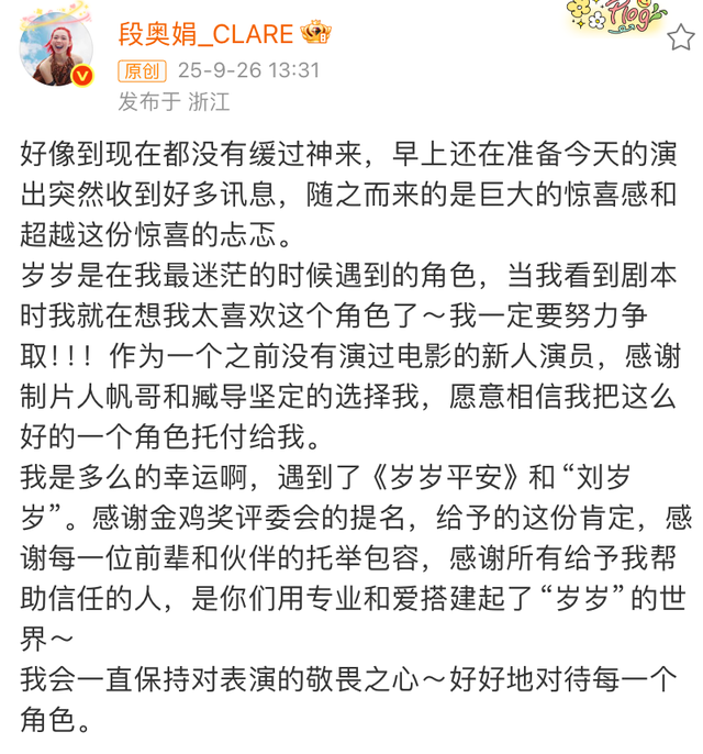段奥娟本人对于自己提名金鸡奖也十分惊喜和意外,她发文称得知消息后一直没有缓过神来,既惊喜更忐忑,看来是对这份荣誉压力山大,作为一名新人演员,感谢导演组坚定地用她,也感谢金鸡奖评委会的肯定,未来也会好好对待每一个角色,一直保持对表演的敬畏之心。