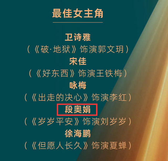 爆冷的是段奥娟,不少网友看到她的名字时都懵了,她不是选秀出道当歌手吗?什么时候转型成演员了,而且还一飞冲天直接提名了金鸡奖,而且她主演的这部《岁岁平安》还未公映就能直接提名,也被不少网友质疑本届金鸡奖的评选标准。