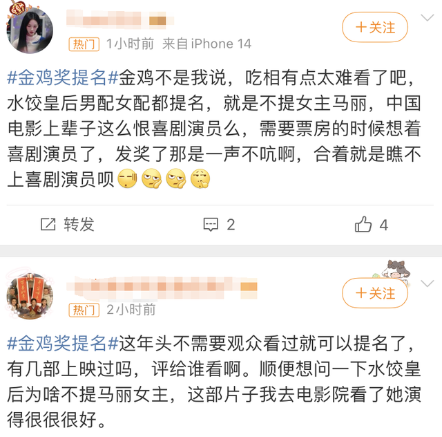 马丽也没有提名,作为中国最具号召力的女演员之一,去年还凭借《第二十条》中李茂娟一角提名了金鸡奖最佳女主,今年就没她什么事了,《水饺皇后》曾被媒体列为今年金鸡奖影后热门候选,但可惜没有被提名。