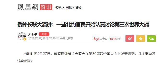 9月28日据凤凰网援引联合国官网消息,当地时间9月27日,正在联合国总部开会的俄外长拉夫罗夫在第80届联合国大会上公开发表讲话,当然外界最关注的就是俄乌冲突的问题。