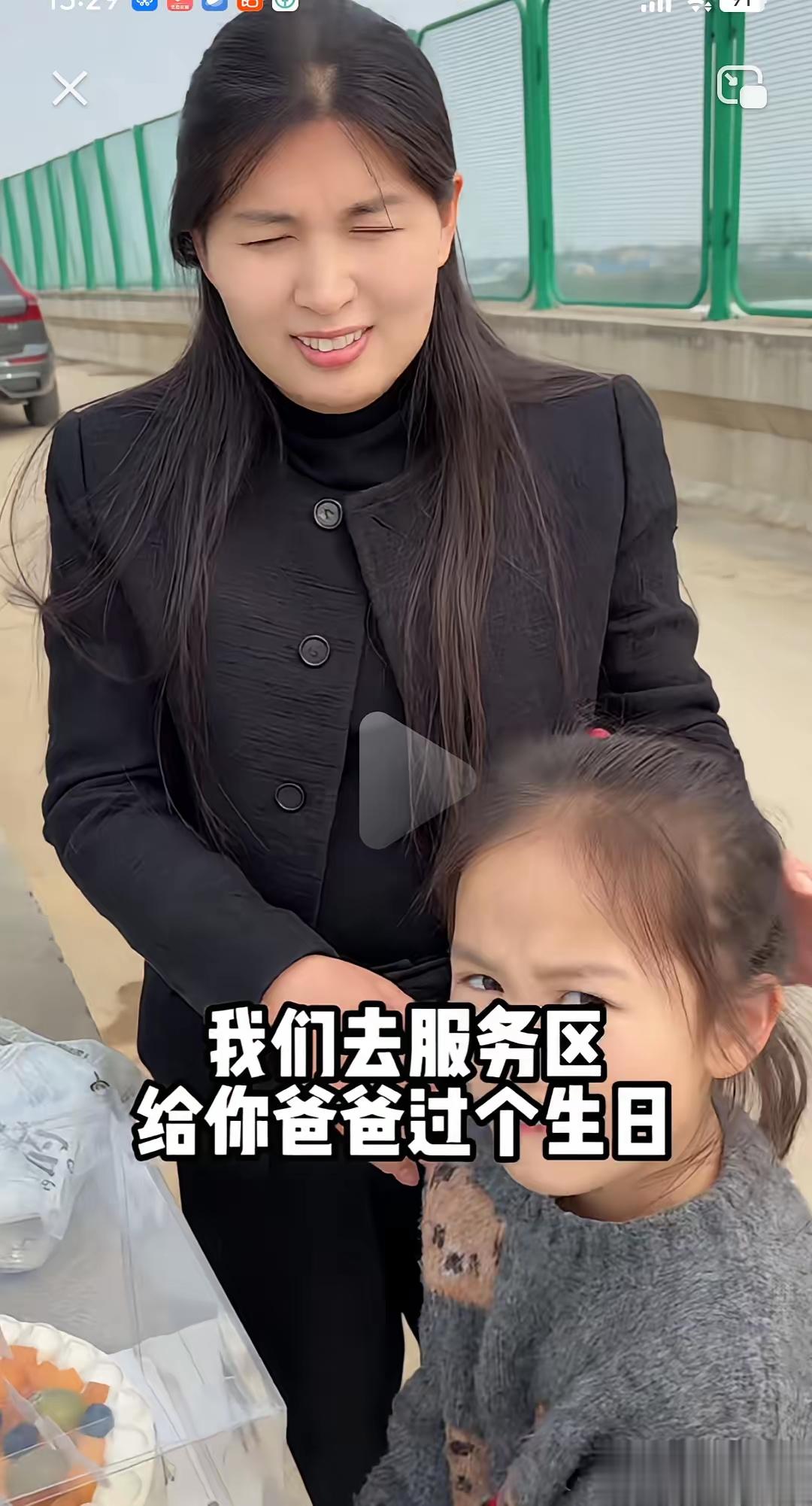 女孩儿和妈妈在高速路边,摆上蛋糕,隔空为爸爸庆生!