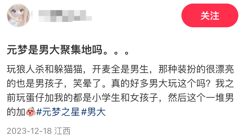 元梦的人气之高,甚至辐射到整个成年玩家群体当中。许多玩家在联机玩狼人杀之类的开麦玩法时,经常会发现对方居然是声音充满磁性的男大学生。要知道男大也是游戏用户中最难被俘获的玩家群体,对游戏素质的要求可不是一般的高。能吸引到如此之多活跃在元梦中的男大玩家,其实从侧面印证了如今元梦到底有多火爆。