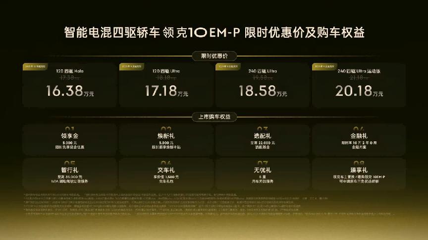 此次领克10 EM-P上市不仅产品力强大,价格同样颇具吸引力。官方给出的上市限时优惠价为16.38万-20.18万元,同时推出8重限时购车权益,进一步降低了年轻用户的购车门槛。作为一款融合原创设计、强劲性能与多元化实用性的中大型电混轿车,领克10 EM-P在上市首日便展现出强大号召力。未来,它有望继续在新能源市场中脱颖而出,带给消费者更多惊喜与价值。