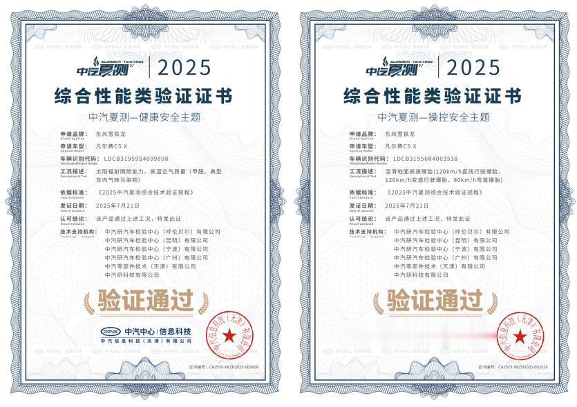 凡尔赛C5 X曾荣获中国十佳车身、C-NCAP五星安全认证、中汽研“驾乘品质之星”等权威背书。2023年5月,凡尔赛C5 X 挑战国内首次高速连环追尾主被动安全联合测试,以12项验证项目全部合格通过的优秀成绩,获得“3A”评价;2025年7月,在2025中汽夏测中通过太阳辐射隔绝能力、高温空气质量及湿滑路面高速爆胎三大测试项目,荣获健康与操控双安全权威验证证书;2025年12月,在中汽中心极寒驾控安全主题技术验证中,以140km/h时速在压实雪面完成前轮爆胎测试,在20%坡度的冰雪路面上满载状态一次登顶成功,获颁“操控稳定性挑战”认证证书。一系列硬核荣誉印证了凡尔赛C5 X经得起推敲的卓越品质。
