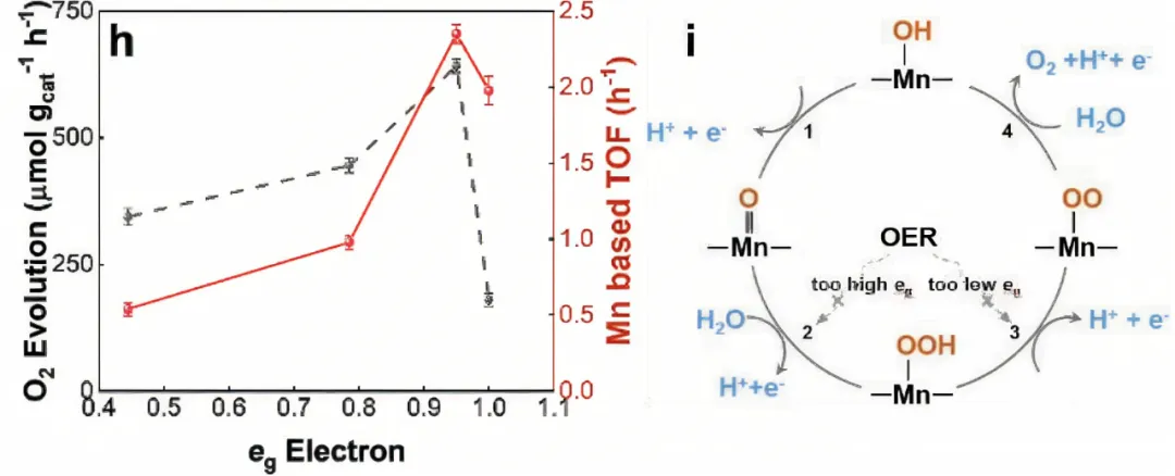 图5.Mn-C3N4中eg占据度与TOF的对应关系及Mn位点上OER的四电子机理。DOI: 10.1002/aenm.201901505。