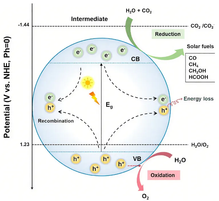 光催化反应主要包含四个过程:反应物(水、氧气、二氧化碳等)的吸附、光吸收、光生载流子的分离与转移,以及中间产物的转化。以光催化剂表面的CO2还原为例(图1)。