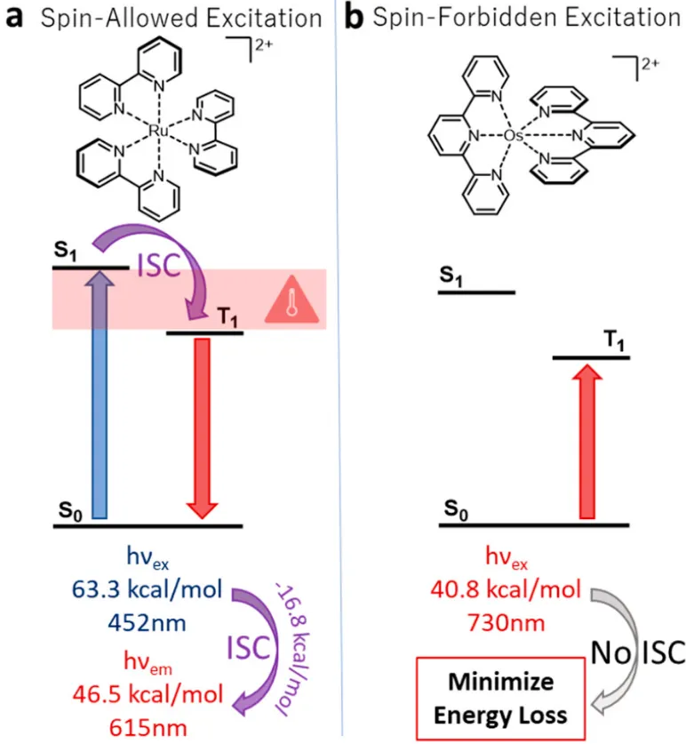 通过调控催化剂中的电子自旋多重性,成功将激发单重态(S0)→激发三重态(T1)的跃迁应用于具有强自旋-轨道耦合的Os(II)聚吡啶配合物,使体系直接通过S0→T1跃迁进入长寿命且具氧化还原活性的T1态,最大程度地降低了体系的系间窜越能量损失(图3)。