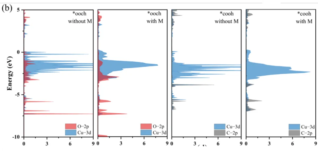 研究人员报道了磁场诱导的自旋极化对CO2RR活性与选择性的影响。态密度(PDOS)显示,自旋极化显著降低Cu的d带中心,同时调节Cu-3d轨道与O/C-2p轨道的杂化强度,从而精细调控中间体的吸附行为(图8)。